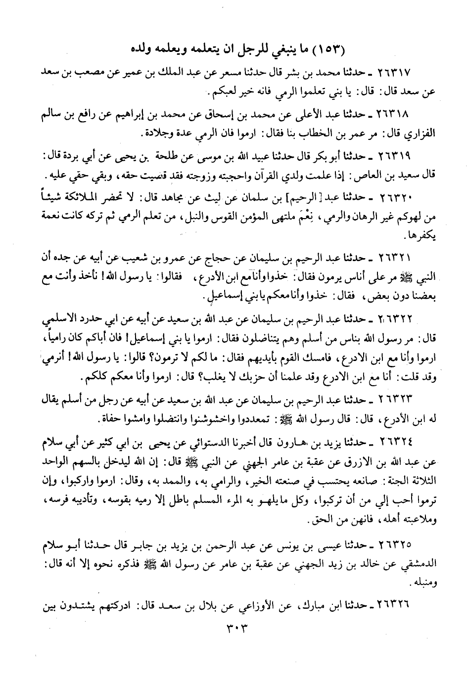 26317 - حَدَّثَنَا مُحَمَّدُ بْنُ بِشْرٍ، قَالَ: حَدَّثَنَا مِسْعَرٌ، عَنْ عَبْدِ الْمَلِكِ بْنِ عُمَيْرٍ، عَنْ مُصْعَبِ بْنِ سَعْدٍ، عَنْ سَعْدٍ، قَالَ: قَالَ: «يَا بَنِيَّ، §تَعَلَّمُوا الرَّمْيَ، فَإِنَّهُ خَيْرُ لَعِبِكُمْ»