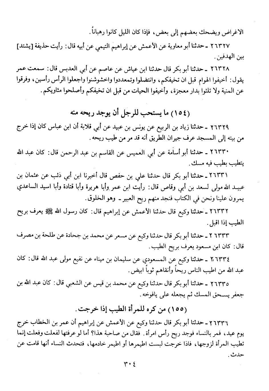 26333 - حَدَّثَنَا أَبُو بَكْرٍ قَالَ: حَدَّثَنَا وَكِيعٌ، عَنْ مِسْعَرٍ، عَنْ مُحَمَّدِ بْنِ جُحَادَةَ، عَنْ طَلْحَةَ بْنِ مُصَرِّفٍ، قَالَ: «كَانَ §ابْنُ مَسْعُودٍ يُعْرَفُ بِرِيحِ الطِّيبِ»
