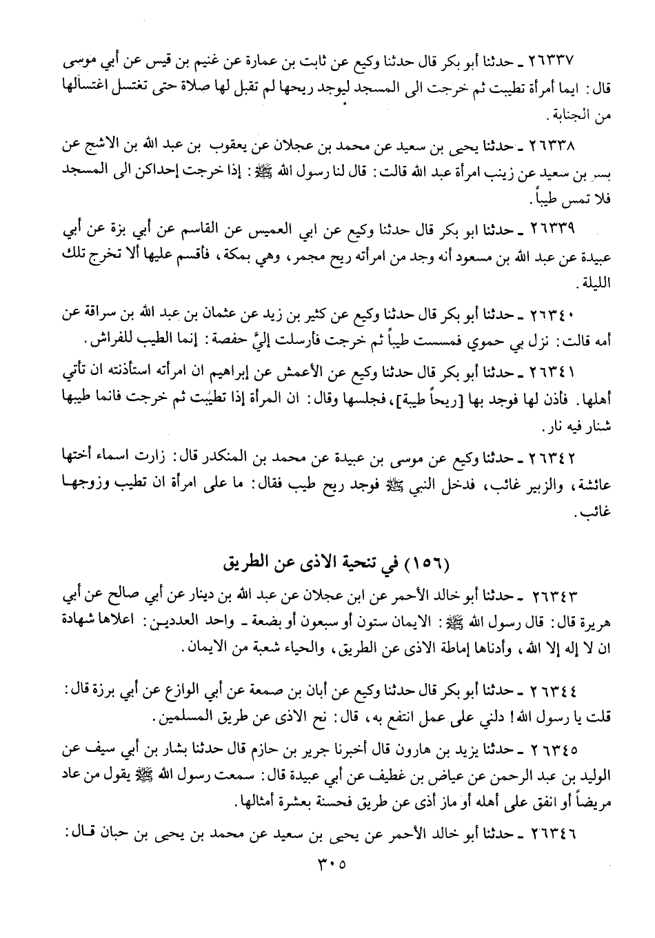 26337 - حَدَّثَنَا أَبُو بَكْرٍ قَالَ: حَدَّثَنَا وَكِيعٌ، عَنْ ثَابِتِ بْنِ عُمَارَةَ، عَنْ غُنَيْمِ بْنِ قَيْسٍ، عَنْ أَبِي مُوسَى، قَالَ: «§أَيُّمَا امْرَأَةٍ تَطَيَّبَتْ، ثُمَّ خَرَجَتْ إِلَى الْمَسْجِدِ لِيُوجَدَ رِيحُهَا لَمْ تُقْبَلْ لَهَا صَلَاةٌ حَتَّى تَغْتَسِلَ اغْتِسَالَهَا مِنَ الْجَنَابَةِ»