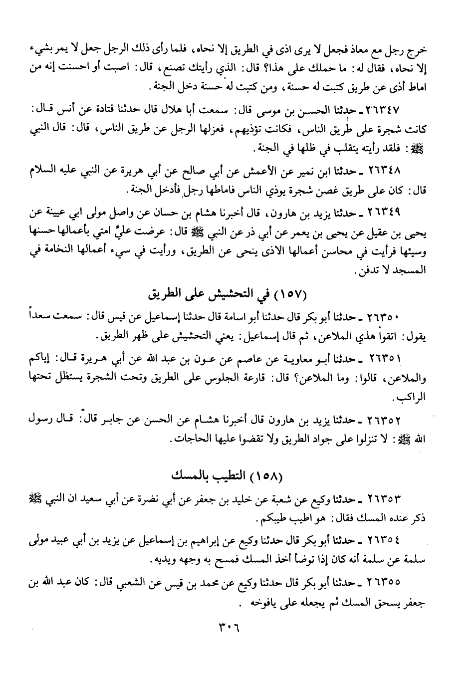 26352 - حَدَّثَنَا يَزِيدُ بْنُ هَارُونَ، قَالَ: أَخْبَرَنَا هِشَامٌ، عَنِ الْحَسَنِ، عَنْ جَابِرٍ، قَالَ: قَالَ رَسُولُ اللَّهِ صَلَّى اللهُ عَلَيْهِ وَسَلَّمَ: «§لَا تَنْزِلُوا عَلَى جَوَادِّ الطَّرِيقِ، وَلَا تَقْضُوا عَلَيْهَا الْحَاجَاتِ»