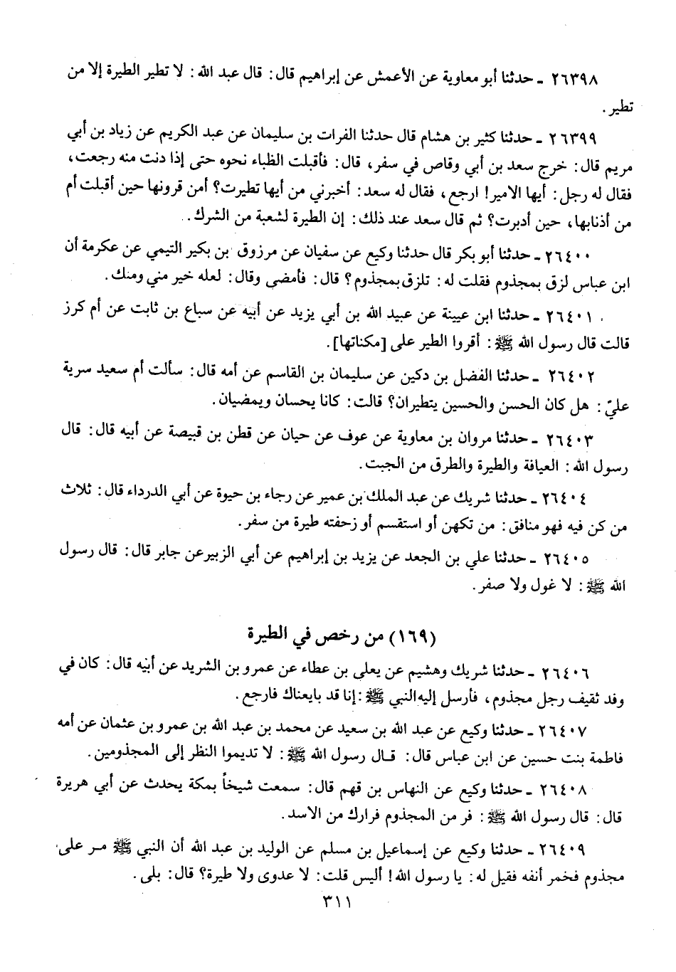 26398 - حَدَّثَنَا أَبُو مُعَاوِيَةَ، عَنِ الْأَعْمَشِ، عَنْ إِبْرَاهِيمَ، قَالَ: قَالَ عَبْدُ اللَّهِ: «§لَا تُطَيِّرُ الطِّيَرَةُ إِلَّا مَنْ تَطَيَّرَ»