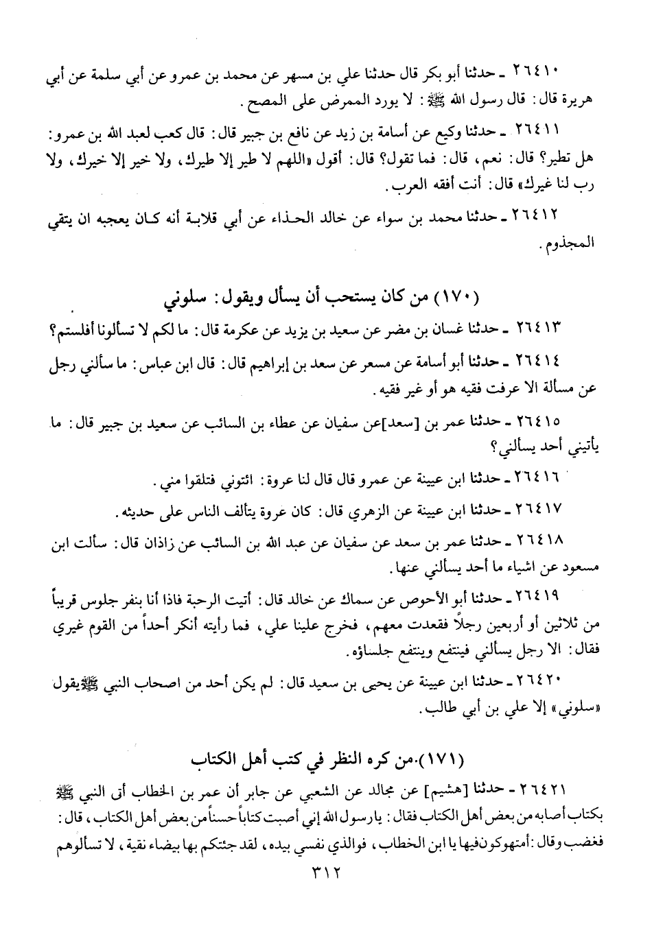 26418 - حَدَّثَنَا عُمَرُ بْنُ سَعْدٍ، عَنْ سُفْيَانَ، عَنْ عَبْدِ اللَّهِ بْنِ السَّائِبِ، عَنْ زَاذَانَ، قَالَ: «§سَأَلْتُ ابْنَ مَسْعُودٍ عَنْ أَشْيَاءَ مَا أَحَدٌ يَسْأَلُنِي عَنْهَا»