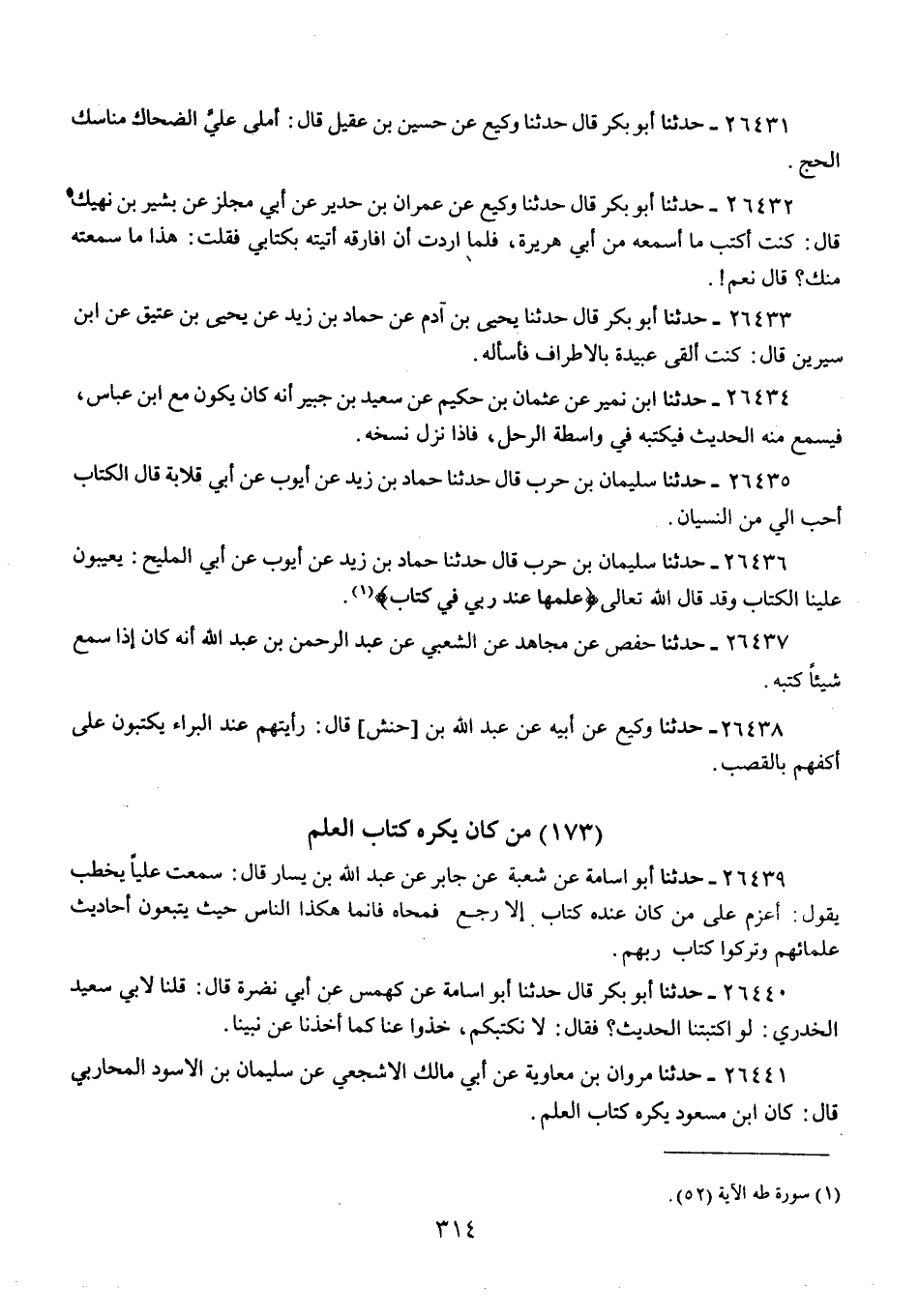26436 - حَدَّثَنَا سُلَيْمَانُ بْنُ حَرْبٍ، قَالَ: حَدَّثَنَا حَمَّادُ بْنُ زَيْدٍ، عَنْ أَيُّوبَ، عَنْ أَبِي الْمَلِيحِ: " §يَعِيبُونَ عَلَيْنَا الْكِتَابَ , وَقَدْ قَالَ اللَّهُ تَعَالَى: {عِلْمُهَا عِنْدَ رَبِّي فِي كِتَابٍ} [طه: 52] "