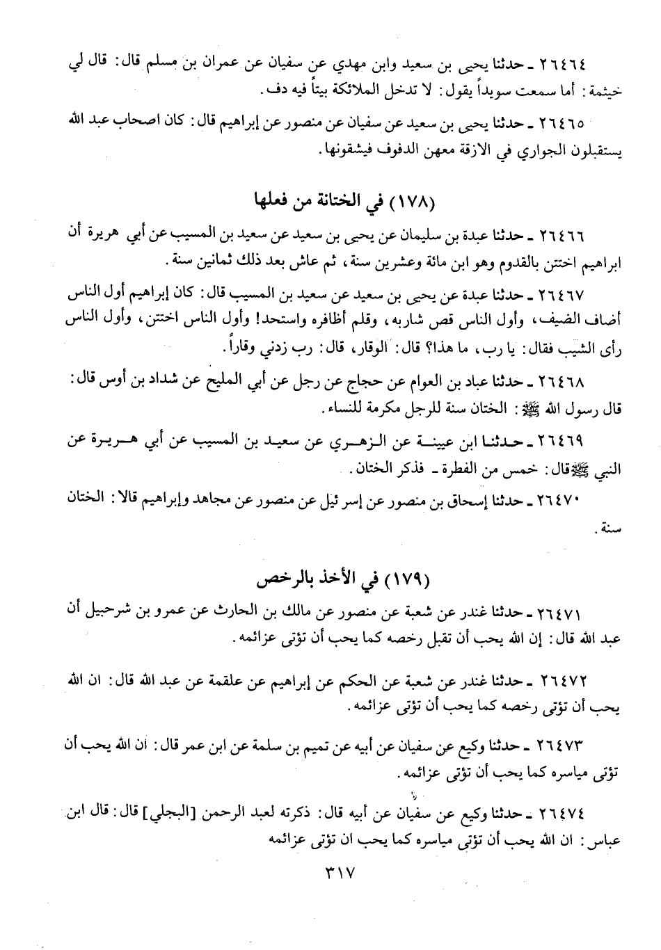 26469 - حَدَّثَنَا ابْنُ عُيَيْنَةَ، عَنِ الزُّهْرِيِّ، عَنْ سَعِيدِ بْنِ الْمُسَيِّبِ، عَنْ أَبِي هُرَيْرَةَ، عَنِ النَّبِيِّ صَلَّى اللهُ عَلَيْهِ وَسَلَّمَ، قَالَ: «§خَمْسٌ مِنَ الْفِطْرَةِ فَذَكَرَ الْخِتَانَ»