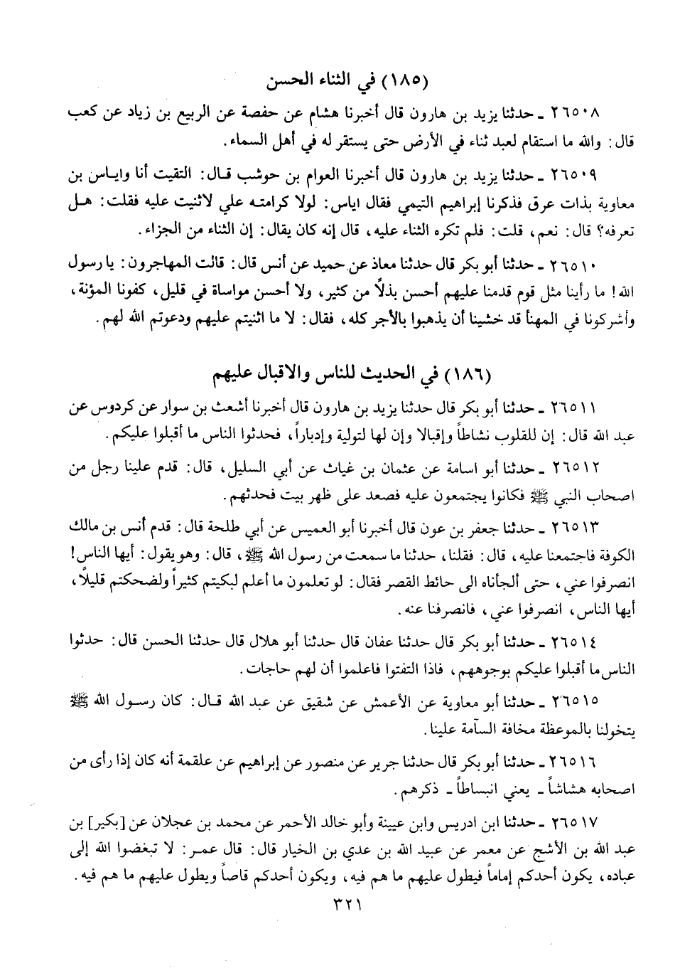 26514 - حَدَّثَنَا أَبُو بَكْرٍ قَالَ: حَدَّثَنَا عَفَّانُ، قَالَ: حَدَّثَنَا أَبُو هِلَالٍ، قَالَ: حَدَّثَنَا الْحَسَنُ، قَالَ: «§حَدِّثُوا النَّاسَ، مَا أَقْبَلُوا عَلَيْكُمْ بِوُجُوهِهِمْ، فَإِذَا الْتَفَتُوا، فَاعْلَمُوا أَنَّ لَهُمْ حَاجَاتٍ»