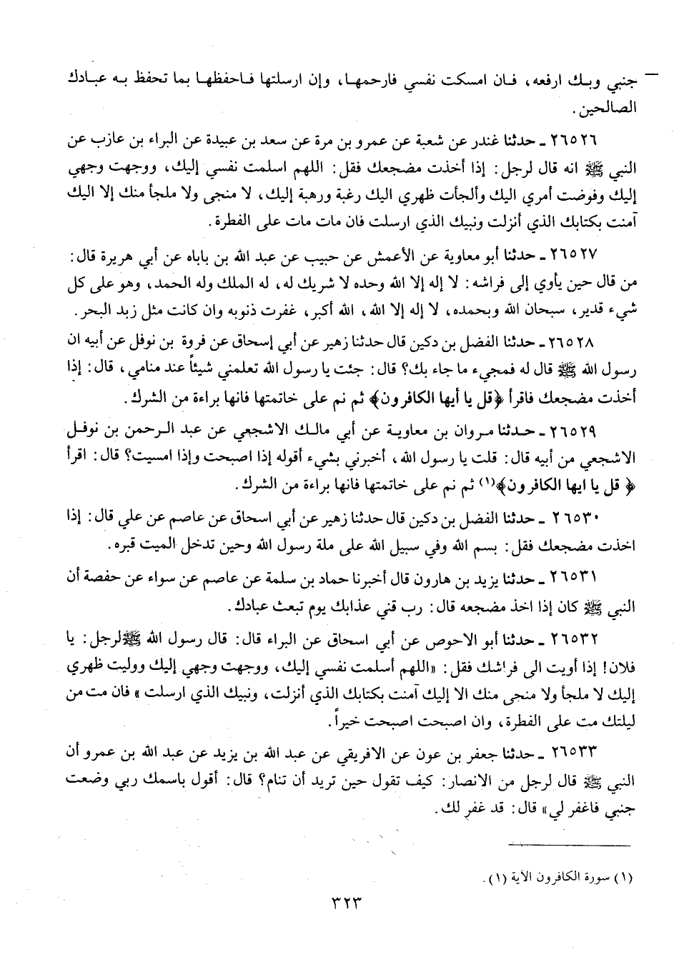 26526 - حَدَّثَنَا غُنْدَرٌ، عَنْ شُعْبَةَ، عَنْ عَمْرِو بْنِ مُرَّةَ، عَنْ سَعْدِ بْنِ عُبَيْدَةَ، عَنِ الْبَرَاءِ بْنِ عَازِبٍ، عَنِ النَّبِيِّ صَلَّى اللهُ عَلَيْهِ وَسَلَّمَ أَنَّهُ قَالَ لِرَجُلٍ: إِذَا أَخَذْتَ مَضْجَعَكَ فَقُلْ: «§اللَّهُمَّ أَسْلَمْتُ نَفْسِي إِلَيْكَ، وَوَجَّهْتُ وَجْهِي إِلَيْكَ، وَفَوَّضْتُ أَمْرِي إِلَيْكَ، وَأَلْجَأْتُ ظَهْرِي إِلَيْكَ، رَغْبَةً وَرَهْبَةً إِلَيْكَ، لَا مَنْجَى وَلَا مَلْجَأَ مِنْكَ إِلَّا إِلَيْكَ، آمَنْتُ بِكِتَابِكَ الَّذِي أَنْزَلْتَ، وَنَبِيِّكَ الَّذِي أَرْسَلْتَ، فَإِنْ مَاتَ مَاتَ عَلَى الْفِطْرَةِ»