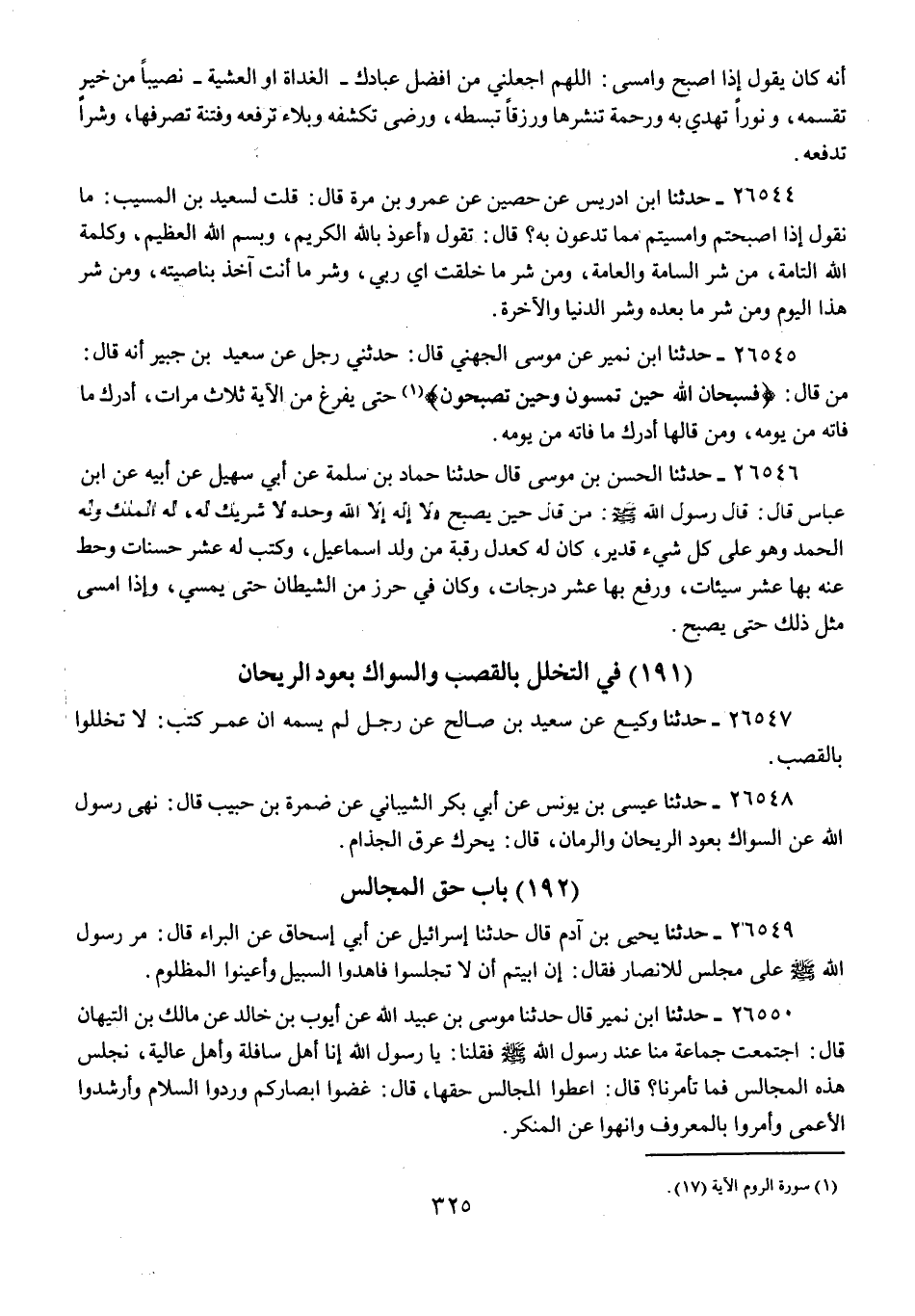26545 - حَدَّثَنَا ابْنُ نُمَيْرٍ، عَنْ مُوسَى الْجُهَنِيِّ، قَالَ: حَدَّثَنِي رَجُلٌ، عَنْ سَعِيدِ بْنِ جُبَيْرٍ، أَنَّهُ قَالَ: " §مَنْ قَالَ: {فَسُبْحَانَ اللَّهِ حِينَ تُمْسُونَ وَحِينَ تُصْبِحُونَ} [الروم: 17] حَتَّى يَفْرُغَ مِنَ الْآيَةِ ثَلَاثَ مَرَّاتٍ، أَدْرَكَ مَا فَاتَهُ مِنْ يَوْمِهِ، وَمَنْ قَالَهَا أَدْرَكَ مَا فَاتَهُ مِنْ يَوْمِهِ "