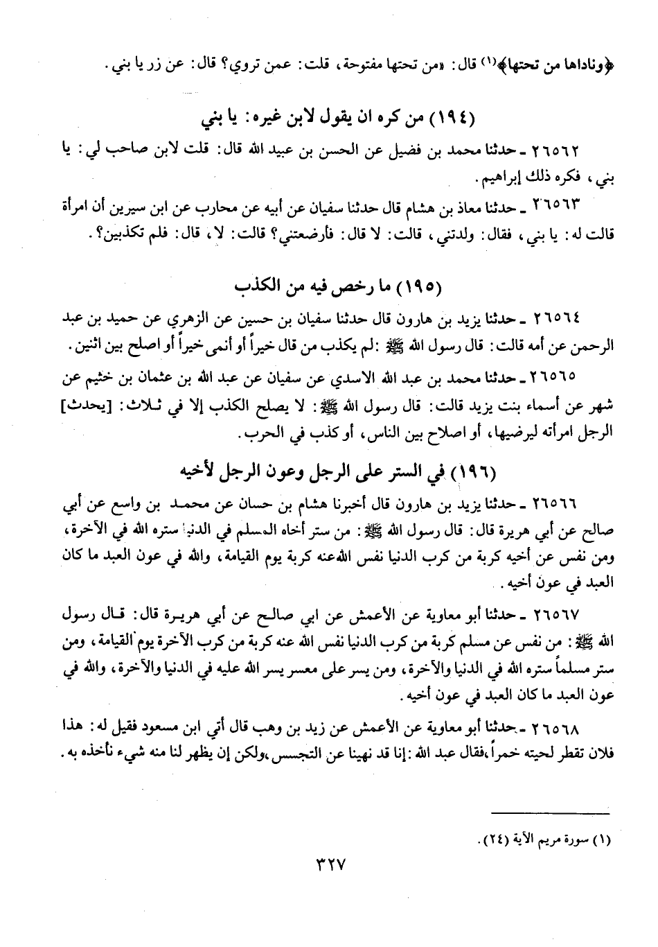 26563 - حَدَّثَنَا مُعَاذُ بْنُ هِشَامٍ، قَالَ: حَدَّثَنَا سُفْيَانُ، عَنْ أَبِيهِ، عَنْ مُحَارِبٍ، عَنِ ابْنِ سِيرِينَ: " أَنِ امْرَأَةً، قَالَتْ لَهُ: يَا بُنَيَّ، فَقَالَ: §وَلَدْتنِي، قَالَتْ: لَا، قَالَ: فَأَرْضَعْتنِي؟ قَالَتْ: لَا، قَالَ: فَلِمَ تَكْذِبِينَ؟ "