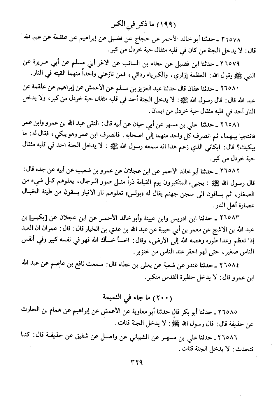 26581 - حَدَّثَنَا عَلِيُّ بْنُ مُسْهِرٍ، عَنْ أَبِي حَيَّانَ، عَنْ أَبِيهِ، قَالَ: الْتَقَى عَبْدُ اللَّهِ بْنُ عَمْرٍو وَابْنُ عُمَرَ فَانْتَجَيَا بَيْنَهُمَا، ثُمَّ انْصَرَفَ كُلُّ وَاحِدٍ مِنْهُمَا إِلَى أَصْحَابِهِ فَانْصَرَفَ ابْنُ عُمَرَ وَهُوَ يَبْكِي، فَقَالَ لَهُ: مَا يُبْكِيكَ؟ قَالَ: أَبْكَانِي الَّذِي زَعَمَ هَذَا أَنَّهُ سَمِعَهُ مِنْ رَسُولِ اللَّهِ صَلَّى اللهُ عَلَيْهِ وَسَلَّمَ: «§لَا يَدْخُلُ الْجَنَّةَ أَحَدٌ فِي قَلْبِهِ مِثْقَالُ حَبَّةِ خَرْدَلٍ مِنْ كِبْرٍ»