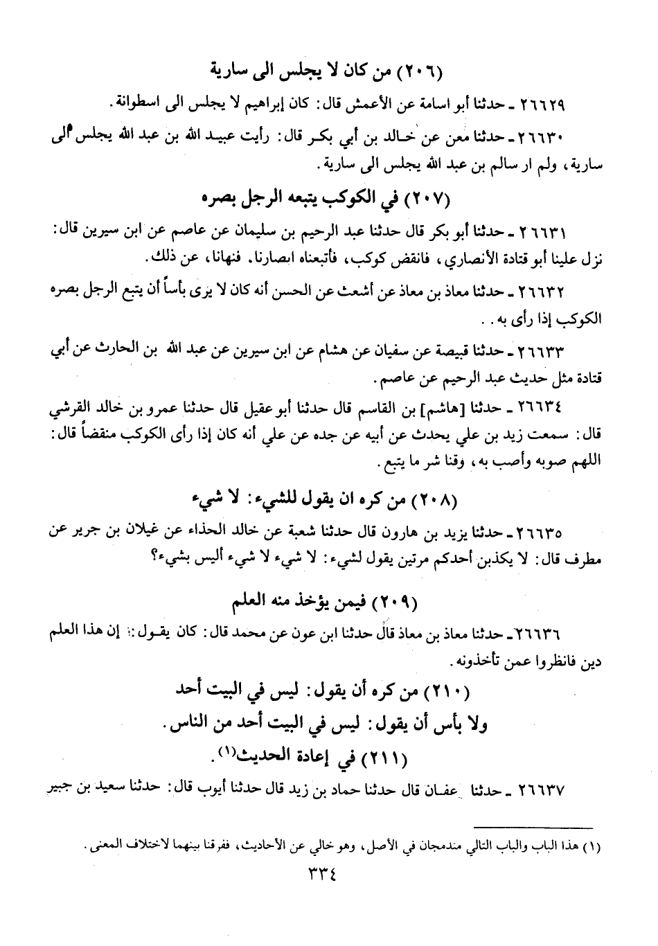 26631 - حَدَّثَنَا أَبُو بَكْرٍ قَالَ: حَدَّثَنَا عَبْدُ الرَّحِيمِ بْنُ سُلَيْمَانَ، عَنْ عَاصِمٍ، عَنِ ابْنِ سِيرِينَ، قَالَ: «§نَزَلَ عَلَيْنَا أَبُو قَتَادَةَ الْأَنْصَارِيُّ، فَانْقَضَّ كَوْكَبٌ، فَأَتْبَعْنَاهُ أَبْصَارَنَا، فَنَهَانَا عَنْ ذَلِكَ»