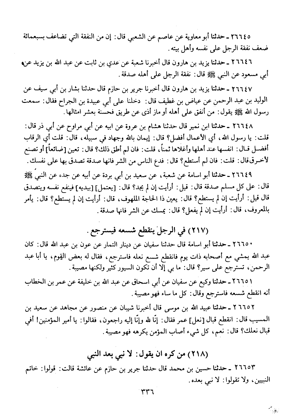 26652 - حَدَّثَنَا عُبَيْدُ اللَّهِ بْنُ مُوسَى، قَالَ: أَخْبَرَنَا شَيْبَانُ، عَنْ مَنْصُورٍ، عَنْ مُجَاهِدٍ، عَنْ سَعِيدِ بْنِ الْمُسَيِّبِ، قَالَ: انْقَطَعَ قُبَالُ نَعْلِ عُمَرَ، فَقَالَ: «§إِنَّا لِلَّهِ وَإِنَّا إِلَيْهِ رَاجِعُونَ»، فَقَالُوا: يَا أَمِيرَ الْمُؤْمِنِينَ، أَفِي قُبَالِ نَعْلِكَ؟ قَالَ: «نَعَمْ، كُلُّ شَيْءٍ أَصَابَ الْمُؤْمِنَ يَكْرَهُهُ , فَهُوَ مُصِيبَةٌ»