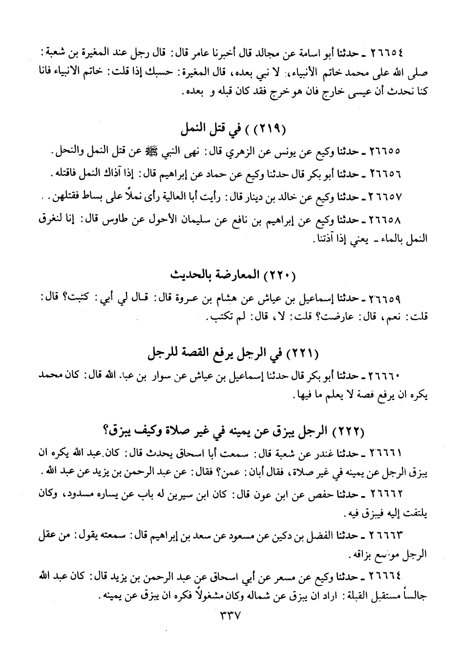 26657 - حَدَّثَنَا وَكِيعٌ، عَنْ خَالِدِ بْنِ دِينَارٍ، قَالَ: «رَأَيْتُ أَبَا الْعَالِيَةِ §رَأَى نَمْلًا عَلَى بِسَاطٍ، فَقَتَلَهُنَّ»