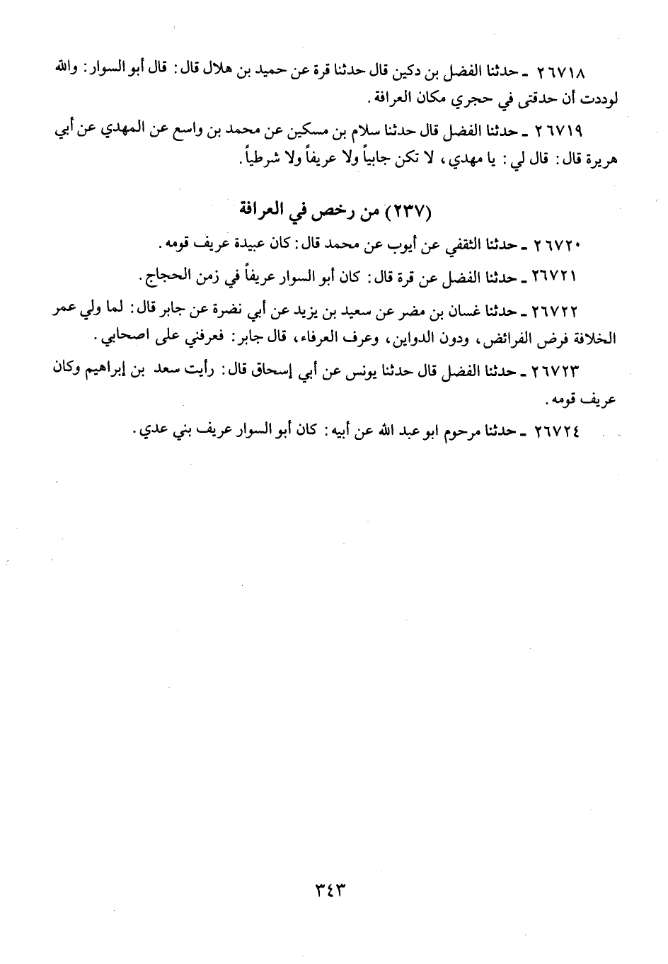 26721 - حَدَّثَنَا الْفَضْلُ، عَنْ قُرَّةَ، قَالَ: «§كَانَ أَبُو السَّوَّارِ عَرِيفًا فِي زَمَنِ الْحَجَّاجِ»