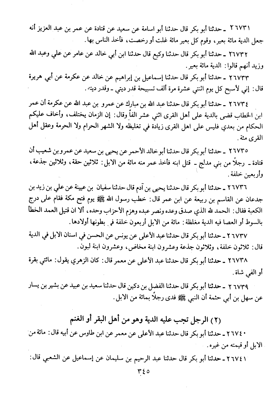 26732 - حَدَّثَنَا أَبُو بَكْرٍ قَالَ: حَدَّثَنَا وَكِيعٌ، قَالَ: حَدَّثَنَا ابْنُ أَبِي خَالِدٍ، عَنْ عَامِرٍ، عَنْ عَلِيٍّ، وَعَبْدِ اللَّهِ، وَزَيْدٍ، أَنَّهُمْ، قَالُوا: «§الدِّيَةُ مِائَةُ بَعِيرٍ»