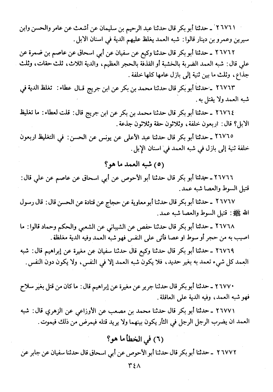 26768 - حَدَّثَنَا أَبُو بَكْرٍ قَالَ: حَدَّثَنَا حَفْصٌ، عَنِ الشَّيْبَانِيِّ، عَنِ الشَّعْبِيِّ، وَالْحَكَمِ، وَحَمَّادٍ، قَالُوا: «§مَا أُصِيبُ بِهِ مِنْ حَجَرٍ، أَوْ سَوْطٍ، أَوْ عَصًا، فَأَتَى عَلَى النَّفْسِ فَهُوَ شِبْهُ الْعَمْدِ، وَفِيهِ الدِّيَةُ مُغَلَّظَةٌ»