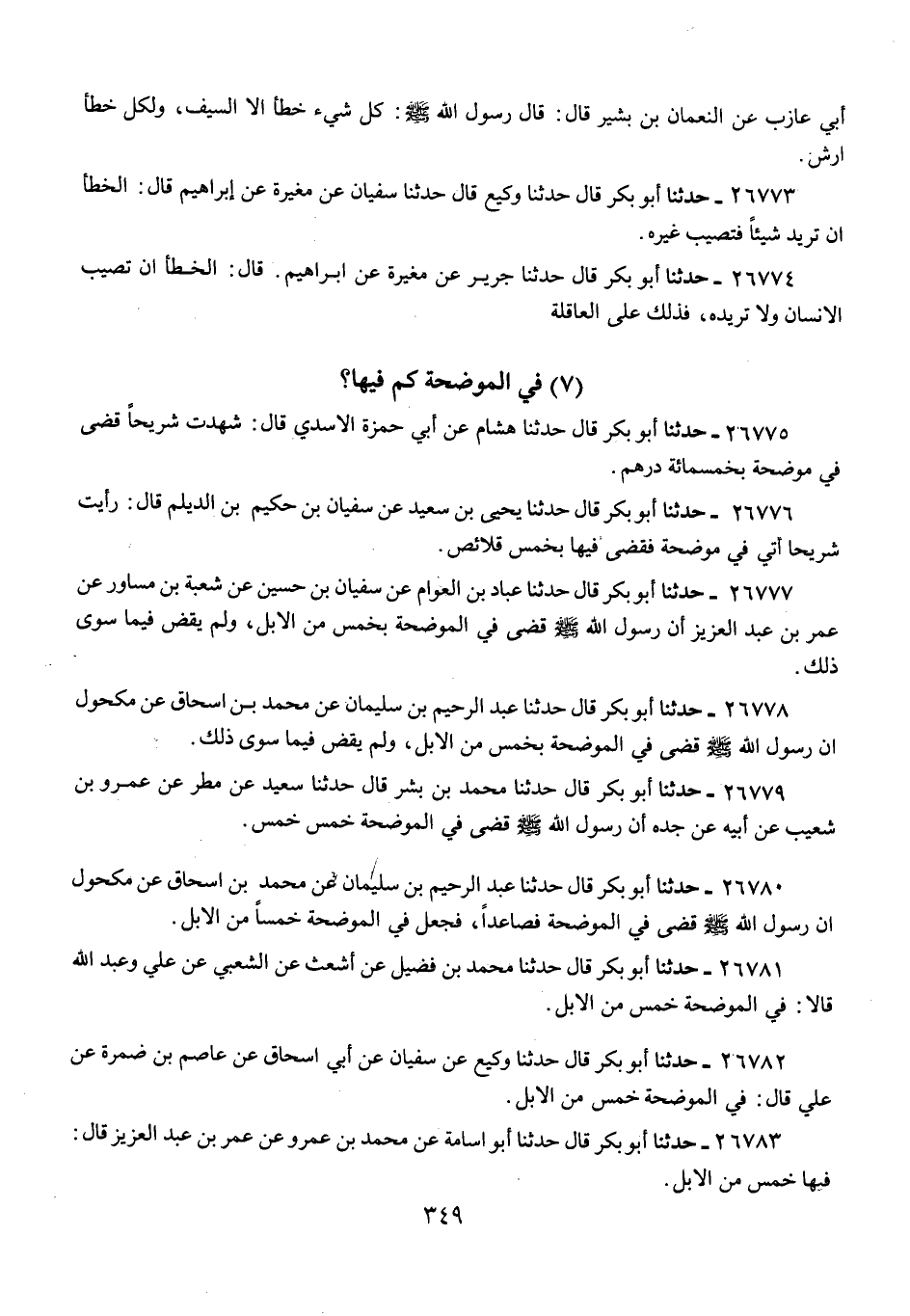 26777 - حَدَّثَنَا أَبُو بَكْرٍ قَالَ: حَدَّثَنَا عَبَّادُ بْنُ الْعَوَّامِ، عَنْ سُفْيَانَ بْنِ حُسَيْنٍ، عَنْ شُعْبَةَ بْنِ مُسَاوِرٍ، عَنْ عُمَرَ بْنِ عَبْدِ الْعَزِيزِ: «أَنَّ رَسُولَ اللَّهِ صَلَّى اللهُ عَلَيْهِ وَسَلَّمَ §قَضَى فِي الْمُوضِحَةِ بِخَمْسٍ مِنَ الْإِبِلِ، وَلَمْ يَقْضِ فِيمَا سِوَى ذَلِكَ»