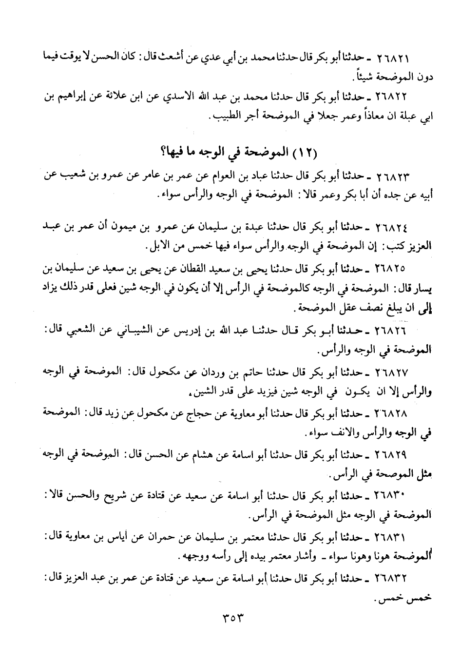 26826 - حَدَّثَنَا أَبُو بَكْرٍ قَالَ: حَدَّثَنَا عَبْدُ اللَّهِ بْنُ إِدْرِيسَ، عَنِ الشَّيْبَانِيِّ، عَنِ الشَّعْبِيِّ، قَالَ: «§الْمُوضِحَةُ فِي الْوَجْهِ وَالرَّأْسِ»