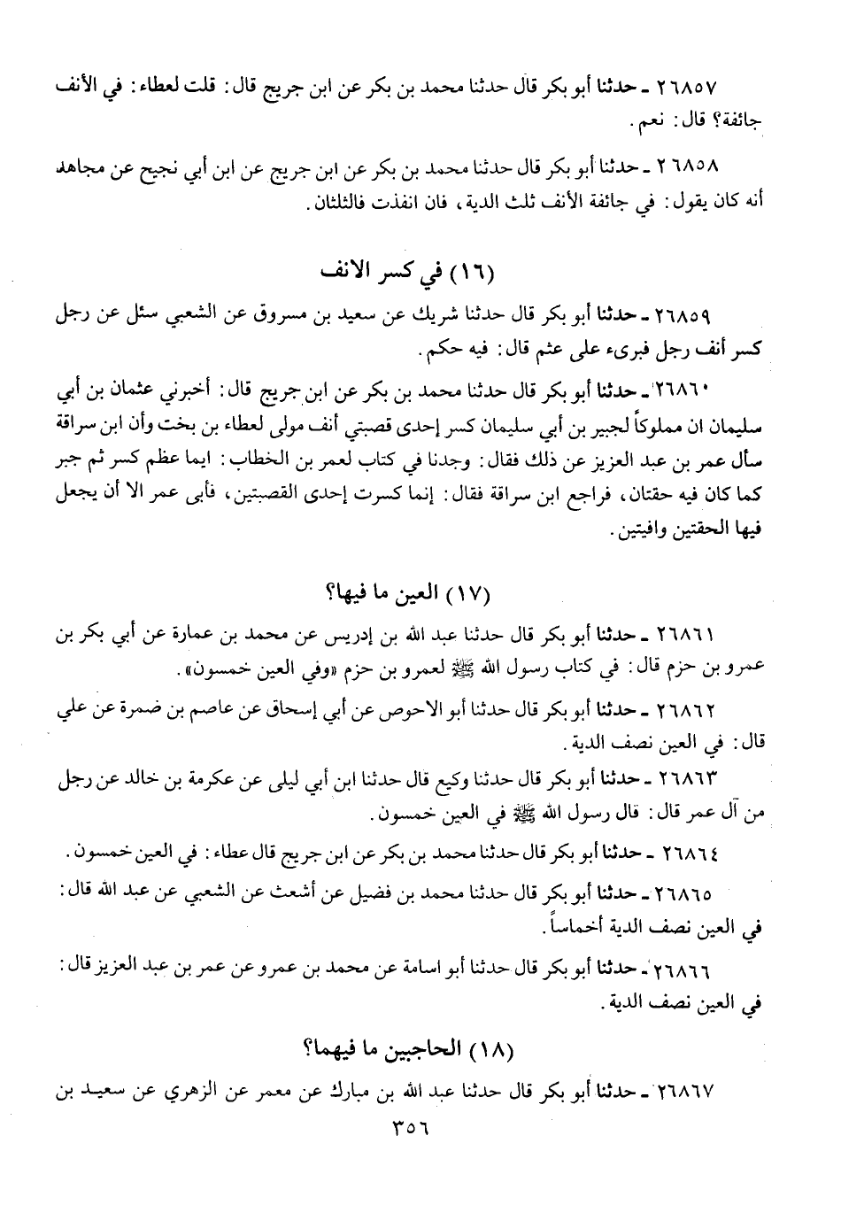 26861 - حَدَّثَنَا أَبُو بَكْرٍ قَالَ: حَدَّثَنَا عَبْدُ اللَّهِ بْنُ إِدْرِيسَ، عَنْ مُحَمَّدِ بْنِ عُمَارَةَ، عَنْ أَبِي بَكْرِ بْنِ عَمْرِو بْنِ حَزْمٍ، قَالَ: «§فِي كِتَابِ رَسُولِ اللَّهِ صَلَّى اللهُ عَلَيْهِ وَسَلَّمَ لِعَمْرِو بْنِ حَزْمٍ وَفِي الْعَيْنِ خَمْسُونَ»