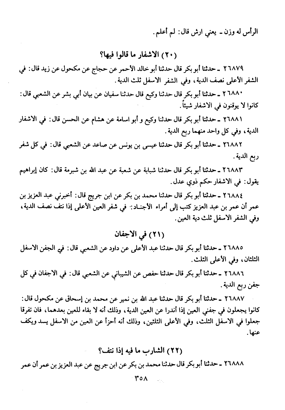 26886 - حَدَّثَنَا أَبُو بَكْرٍ قَالَ: حَدَّثَنَا حَفْصٌ، عَنِ الشَّيْبَانِيِّ، عَنِ الشَّعْبِيِّ، قَالَ: «§فِي الْأَجْفَانِ فِي كُلِّ جَفْنٍ رُبْعُ الدِّيَةِ»