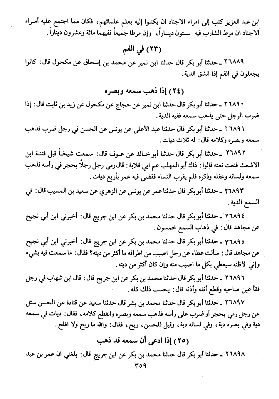 26894 - حَدَّثَنَا أَبُو بَكْرٍ قَالَ: حَدَّثَنَا مُحَمَّدُ بْنُ بَكْرٍ، عَنِ ابْنِ جُرَيْجٍ، قَالَ: أَخْبَرَنِي ابْنُ أَبِي نَجِيحٍ، عَنْ مُجَاهِدٍ، قَالَ: «§فِي ذَهَابِ السَّمْعِ خَمْسُونَ»