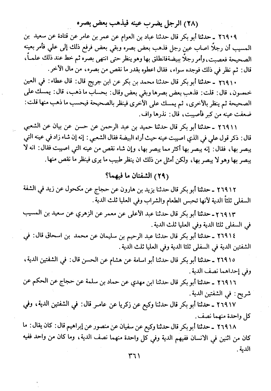 26909 - حَدَّثَنَا أَبُو بَكْرٍ قَالَ: حَدَّثَنَا عَبَّادُ بْنُ الْعَوَّامِ، عَنْ عُمَرَ بْنِ عَامِرٍ، عَنْ قَتَادَةَ، عَنْ سَعِيدِ بْنِ الْمُسَيِّبِ: أَنَّ رَجُلًا أَصَابَ عَيْنَ رَجُلٍ، فَذَهَبَ بَعْضُ بَصَرِهِ وَبَقِيَ بَعْضٌ، فَرُفِعَ ذَلِكَ إِلَى عَلِيٍّ فَأَمَرَ بِعَيْنِهِ الصَّحِيحَةِ فَعُصِبَتْ، وَأَمَرَ رَجُلًا بِبَيْضَةٍ فَانْطَلَقَ بِهَا وَهُوَ يَنْظُرُ حَتَّى انْتَهَى بَصَرُهُ، ثُمَّ خَطَّ عِنْدَ ذَلِكَ عَلَمًا، قَالَ: ثُمَّ نَظَرَ فِي ذَلِكَ فَوَجَدَهُ سَوَاءً، فَقَالَ: «§أُعْطَوْهُ بِقَدْرِ مَا نَقَصَ مِنْ بَصَرِهِ مِنْ مَالِ الْآخَرِ»