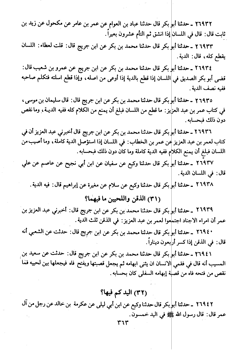 26936 - حَدَّثَنَا أَبُو بَكْرٍ قَالَ: حَدَّثَنَا مُحَمَّدُ بْنُ بَكْرٍ، عَنِ ابْنِ جُرَيْجٍ، قَالَ: أَخْبَرَنِي عَبْدُ الْعَزِيزِ، أَنَّ فِي كِتَابٍ لِعُمَرَ بْنِ عَبْدِ الْعَزِيزِ، عَنْ عُمَرَ بْنِ الْخَطَّابِ: «§فِي اللِّسَانِ إِذَا اسْتُؤْصِلَ الدِّيَةُ كَامِلَةً، وَمَا أُصِيبَ مِنَ اللِّسَانِ فَبَلَغَ أَنْ يَمْنَعَ الْكَلَامَ فَفِيهِ الدِّيَةُ كَامِلَةً، وَمَا كَانَ دُونَ ذَلِكَ فَبِحِسَابِهِ»