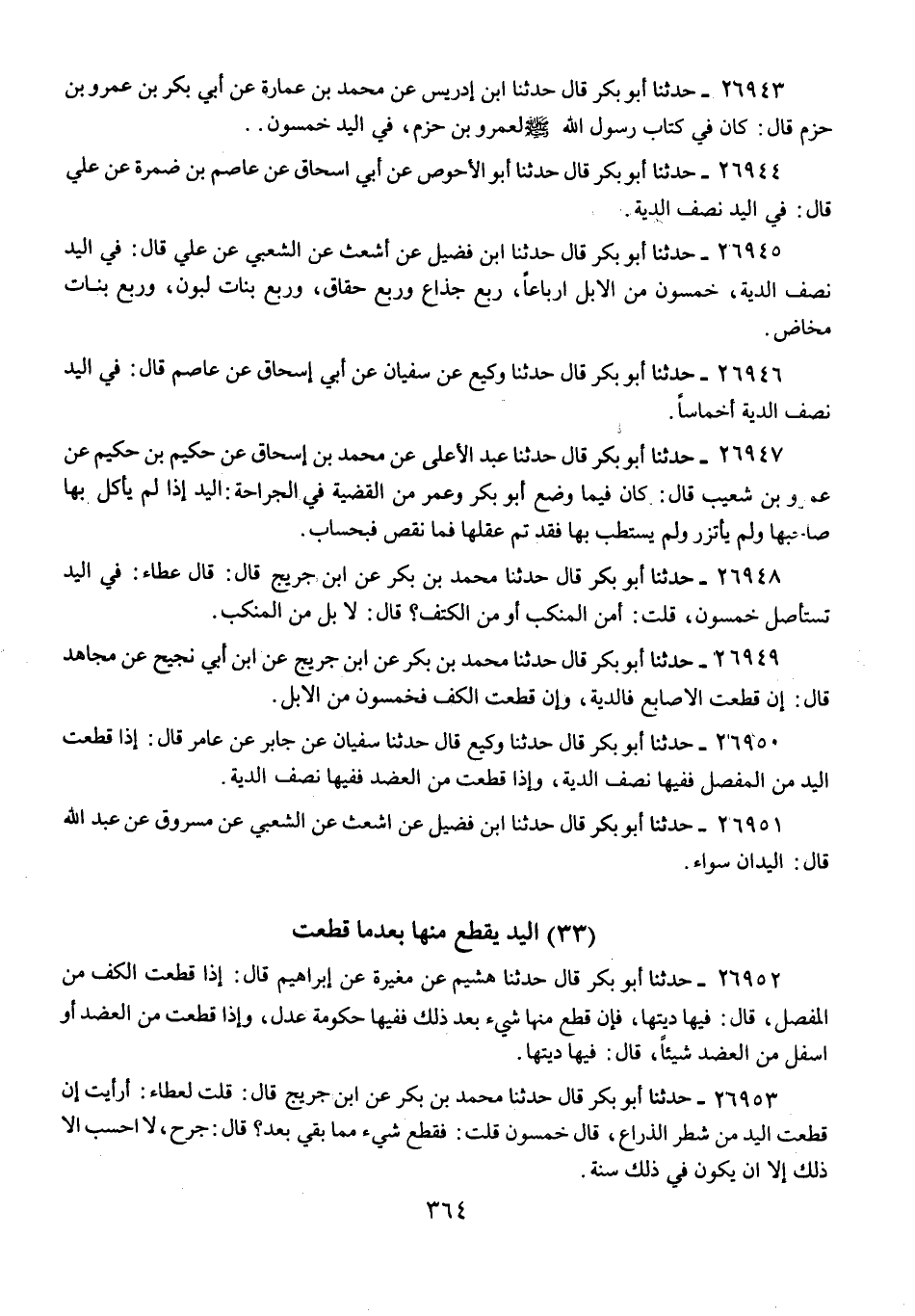 26943 - حَدَّثَنَا أَبُو بَكْرٍ قَالَ: حَدَّثَنَا ابْنُ إِدْرِيسَ، عَنْ مُحَمَّدِ بْنِ عُمَارَةَ، عَنْ أَبِي بَكْرِ بْنِ عَمْرِو بْنِ حَزْمٍ، قَالَ: كَانَ فِي كِتَابِ رَسُولِ اللَّهِ صَلَّى اللهُ عَلَيْهِ وَسَلَّمَ لِعَمْرِو بْنِ حَزْمٍ: «§فِي الْيَدِ خَمْسُونَ»
