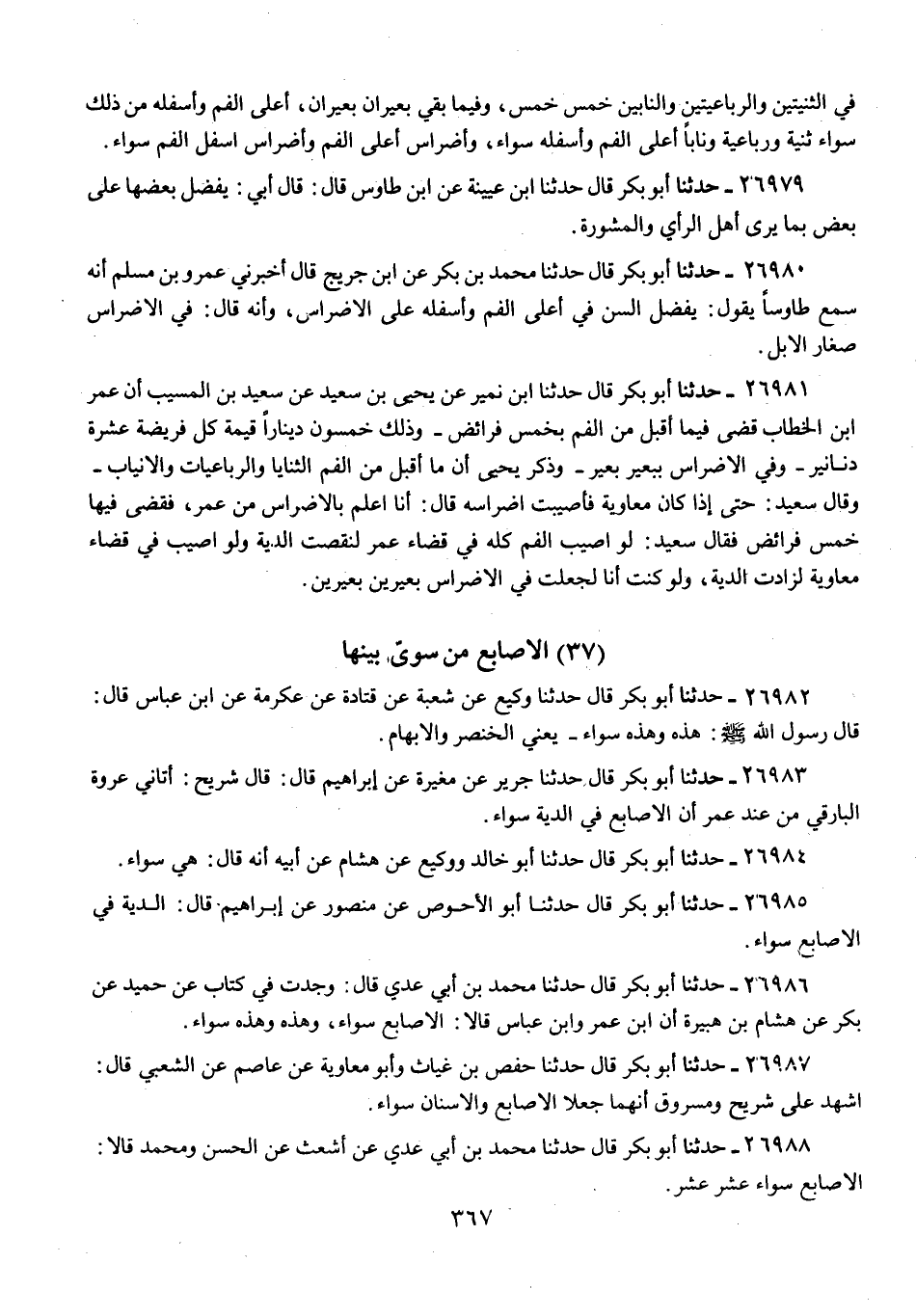 26986 - حَدَّثَنَا أَبُو بَكْرٍ قَالَ: حَدَّثَنَا مُحَمَّدُ بْنُ أَبِي عَدِيٍّ، قَالَ: وَجَدْتُ فِي كِتَابٍ عَنْ حُمَيْدٍ، عَنْ بَكْرٍ، عَنْ هِشَامِ بْنِ هُبَيْرَةٍ: أَنَّ ابْنَ عُمَرَ، وَابْنَ عَبَّاسٍ، قَالَا: «§الْأَصَابِعُ سَوَاءٌ، وَهَذِهِ وَهَذِهِ سَوَاءٌ»