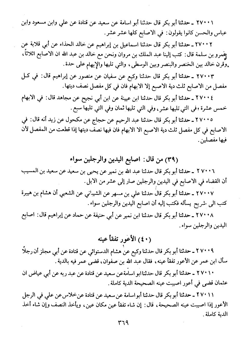 27005 - حَدَّثَنَا أَبُو بَكْرٍ قَالَ: حَدَّثَنَا عَبْدُ الرَّحِيمِ، عَنْ حَجَّاجٍ، عَنْ مَكْحُولٍ، عَنْ زَيْدٍ أَنَّهُ قَالَ: «§فِي الْأَصَابِعِ فِي كُلِّ مِفْصَلٍ ثُلُثُ دِيَةِ الْأُصْبُعِ إِلَّا الْإِبْهَامَ، فَإِنَّ فِيهَا نِصْفَ دِيَتِهَا، إِذَا قُطِعَتْ مِنَ الْمِفْصَلِ لِأَنَّ فِيهَا مِفْصَلَيْنِ»