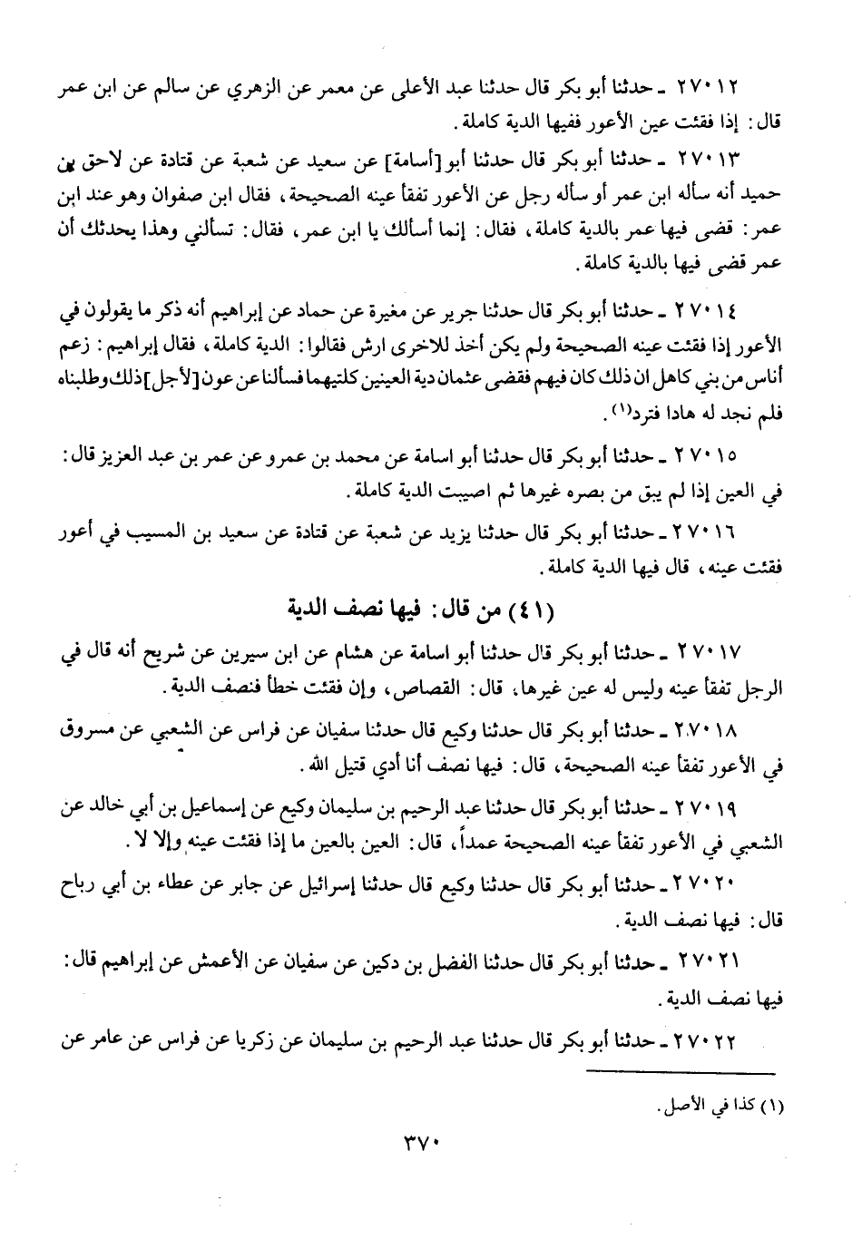27021 - حَدَّثَنَا أَبُو بَكْرٍ قَالَ: حَدَّثَنَا الْفَضْلُ بْنُ دُكَيْنٍ، عَنْ سُفْيَانَ، عَنِ الْأَعْمَشِ، عَنْ إِبْرَاهِيمَ، قَالَ: «§فِيهَا نِصْفُ الدِّيَةِ»