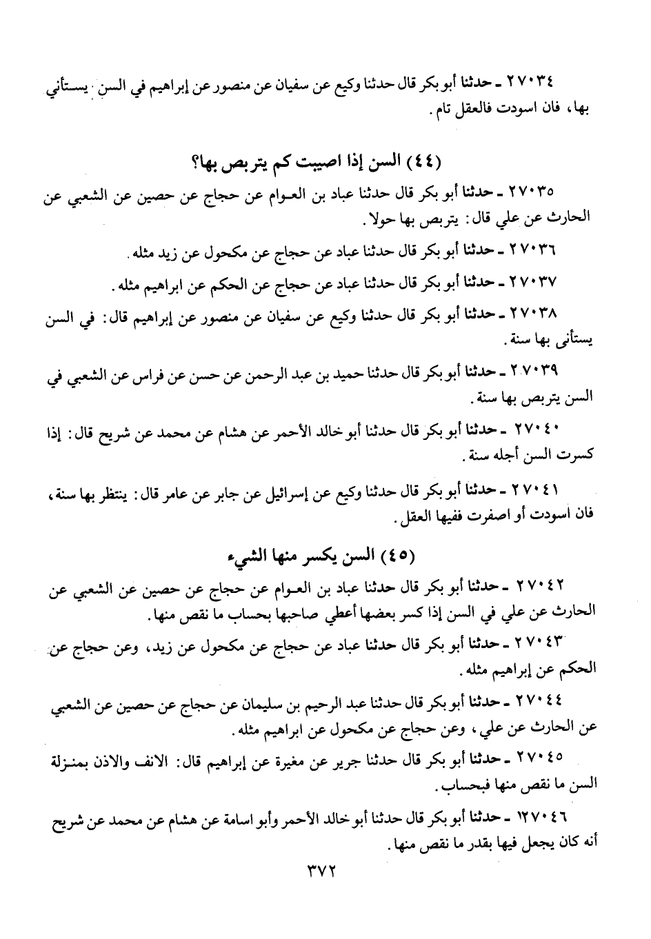 27038 - حَدَّثَنَا أَبُو بَكْرٍ قَالَ: حَدَّثَنَا وَكِيعٌ، عَنْ سُفْيَانَ، عَنْ مَنْصُورٍ، عَنْ إِبْرَاهِيمَ، قَالَ: «§فِي السِّنِّ يَسْتَأْنِي بِهَا سَنَةً»