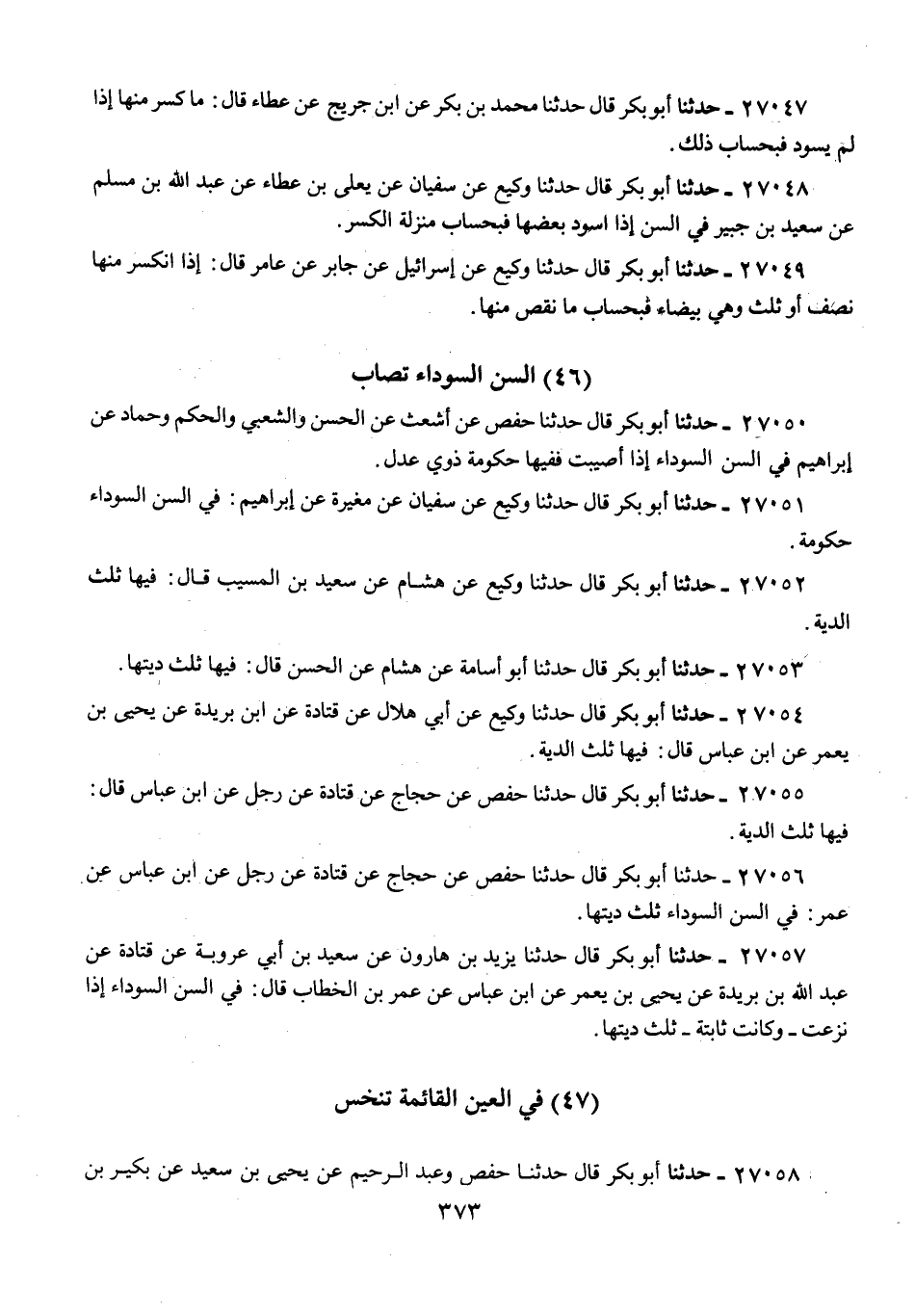 27056 - حَدَّثَنَا أَبُو بَكْرٍ قَالَ: حَدَّثَنَا حَفْصٌ، عَنْ حَجَّاجٍ، عَنْ قَتَادَةَ، عَنْ رَجُلٍ، عَنِ ابْنِ عَبَّاسٍ، عَنْ عُمَرَ: «§فِي السِّنِّ السَّوْدَاءِ ثُلُثُ دِيَتِهَا»