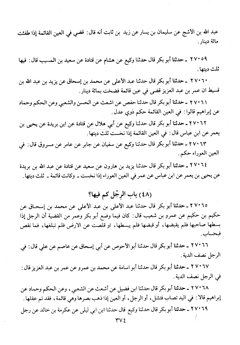27060 - حَدَّثَنَا أَبُو بَكْرٍ قَالَ: حَدَّثَنَا عَبْدُ الْأَعْلَى، عَنْ مُحَمَّدِ بْنِ إِسْحَاقَ، عَنْ يَزِيدَ بْنِ عَبْدِ اللَّهِ بْنِ قُسَيْطٍ، أَنَّ عُمَرَ بْنَ عَبْدِ الْعَزِيزِ «§قَضَى فِي عَيْنٍ قَائِمَةٍ، فُضِخَتْ بِمِائَةِ دِينَارٍ»