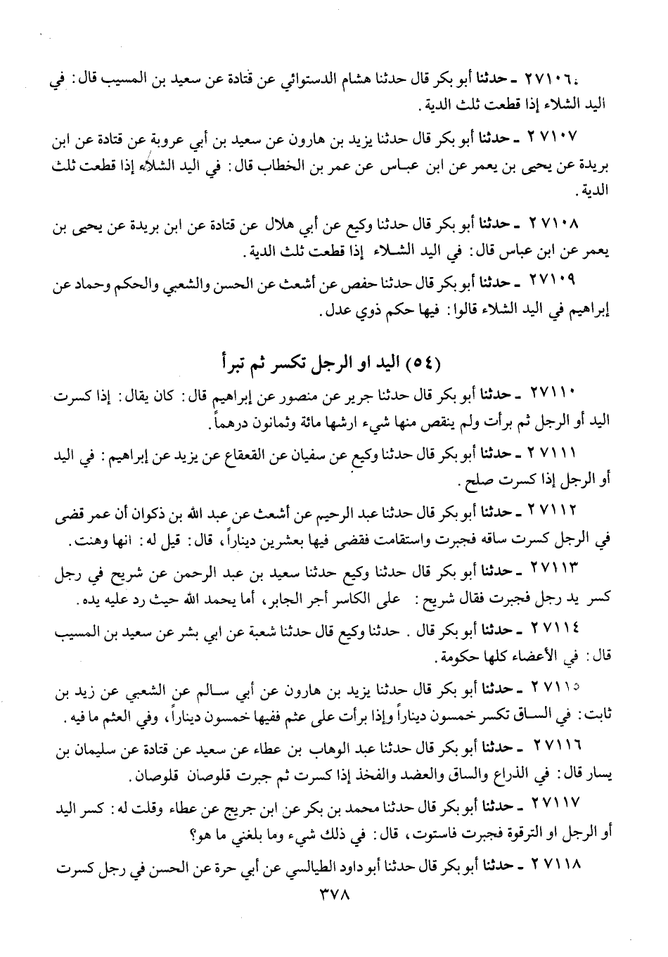 27106 - حَدَّثَنَا أَبُو بَكْرٍ قَالَ: حَدَّثَنَا هِشَامٌ الدَّسْتُوَائِيُّ، عَنْ قَتَادَةَ، عَنْ سَعِيدِ بْنِ الْمُسَيِّبِ، قَالَ: «§فِي الْيَدِ الشَّلَّاءِ إِذَا قُطِعَتْ ثُلُثُ الدِّيَةِ»