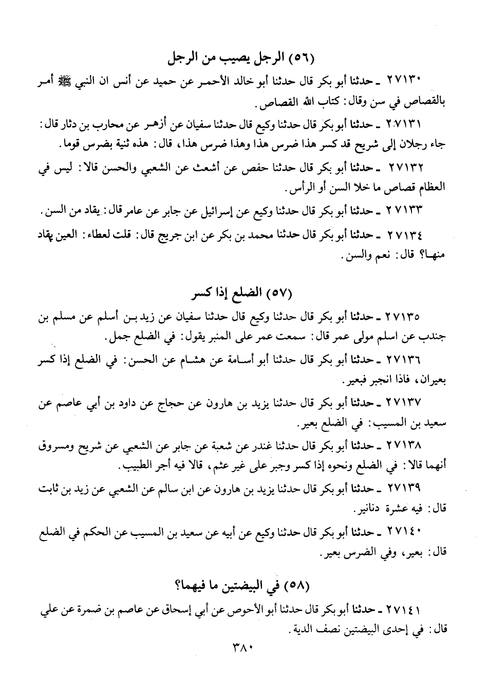 27132 - حَدَّثَنَا أَبُو بَكْرٍ قَالَ: حَدَّثَنَا حَفْصٌ، عَنْ أَشْعَثَ، عَنِ الشَّعْبِيِّ، وَالْحَسَنِ، قَالَا: «§لَيْسَ فِي الْعِظَامِ قِصَاصٌ مَا خَلَا السِّنَّ أَوِ الرَّأْسَ»