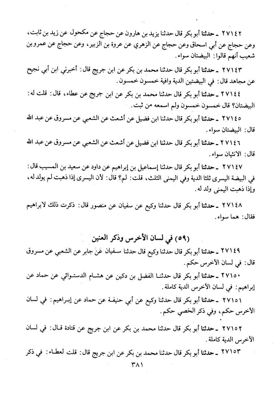 27150 - حَدَّثَنَا أَبُو بَكْرٍ قَالَ: حَدَّثَنَا الْفَضْلُ بْنُ دُكَيْنٍ، عَنْ هِشَامٍ الدَّسْتُوَائِيِّ، عَنْ حَمَّادٍ، عَنْ إِبْرَاهِيمَ: «§فِي لِسَانِ الْأَخْرَسِ الدِّيَةُ كَامِلَةً»