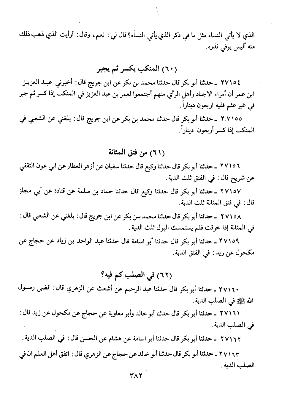 27163 - حَدَّثَنَا أَبُو بَكْرٍ قَالَ: حَدَّثَنَا أَبُو خَالِدٍ، عَنْ حَجَّاجٍ، عَنِ الزُّهْرِيِّ، قَالَ: «§اتَّفَقَ أَهْلُ الْعِلْمِ أَنَّ فِي الصُّلْبِ الدِّيَةَ»