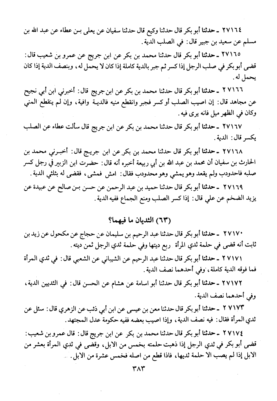 27165 - حَدَّثَنَا أَبُو بَكْرٍ قَالَ: حَدَّثَنَا مُحَمَّدُ بْنُ بَكْرٍ، عَنِ ابْنِ جُرَيْجٍ، عَنْ عَمْرِو بْنِ شُعَيْبٍ، قَالَ: «§قَضَى أَبُو بَكْرٍ فِي صُلْبِ الرَّجُلِ إِذَا كُسِرَ، ثُمَّ جُبِرَ بِالدِّيَةِ كَامِلَةً إِذَا كَانَ لَا يُحْمَلُ لَهُ، وَبِنِصْفِ الدِّيَةِ إِذَا كَانَ يُحْمَلُ لَهُ»