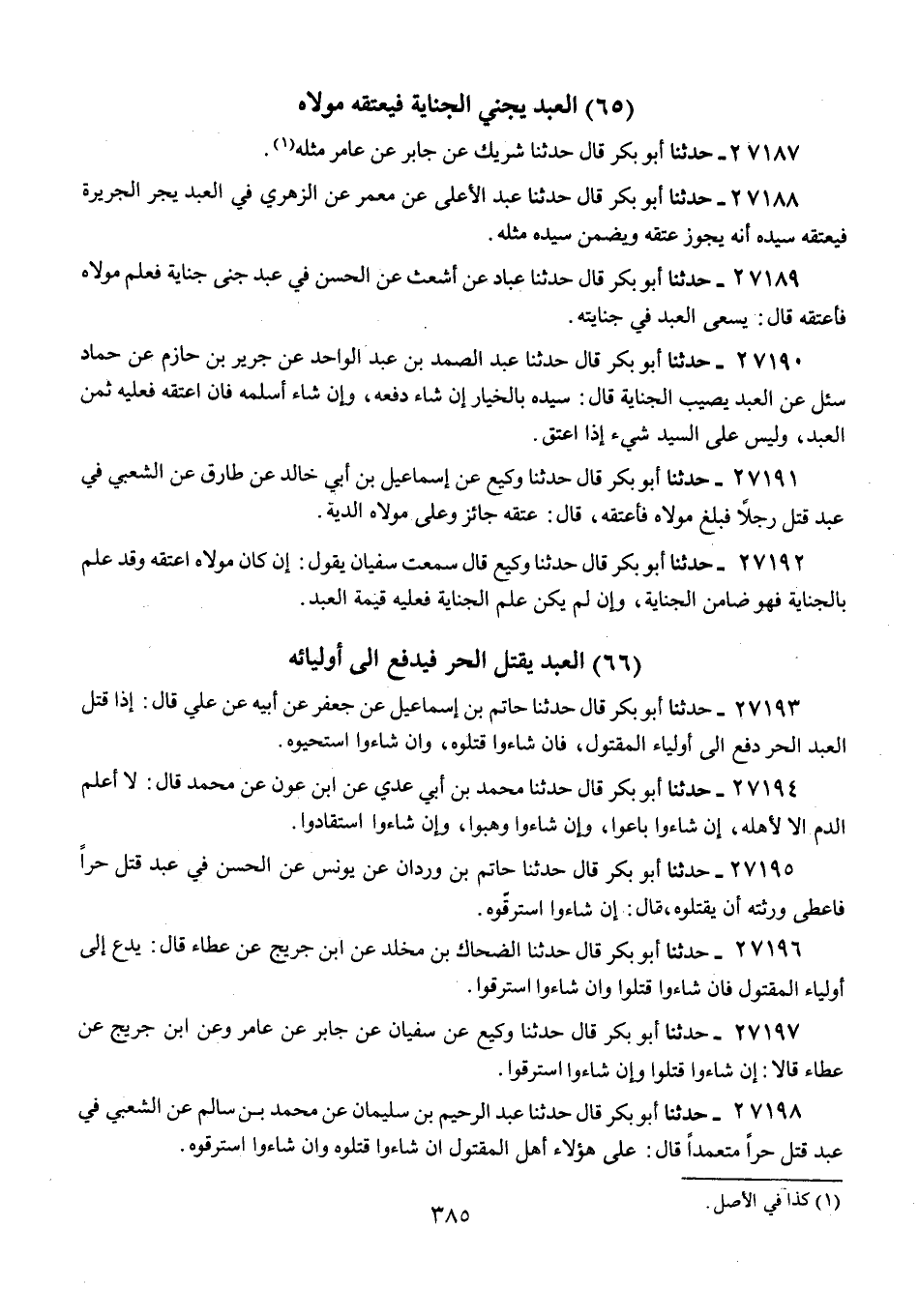 27193 - حَدَّثَنَا أَبُو بَكْرٍ قَالَ: حَدَّثَنَا حَاتِمُ بْنُ إِسْمَاعِيلَ، عَنْ جَعْفَرٍ، عَنْ أَبِيهِ، عَنْ عَلِيٍّ، قَالَ: «إِذَا §قَتَلَ الْعَبْدُ الْحُرَّ، دُفِعَ إِلَى أَوْلِيَاءِ الْمَقْتُولِ، فَإِنْ شَاءُوا قَتَلُوهُ، وَإِنْ شَاءُوا اسْتَحْيَوْهُ»