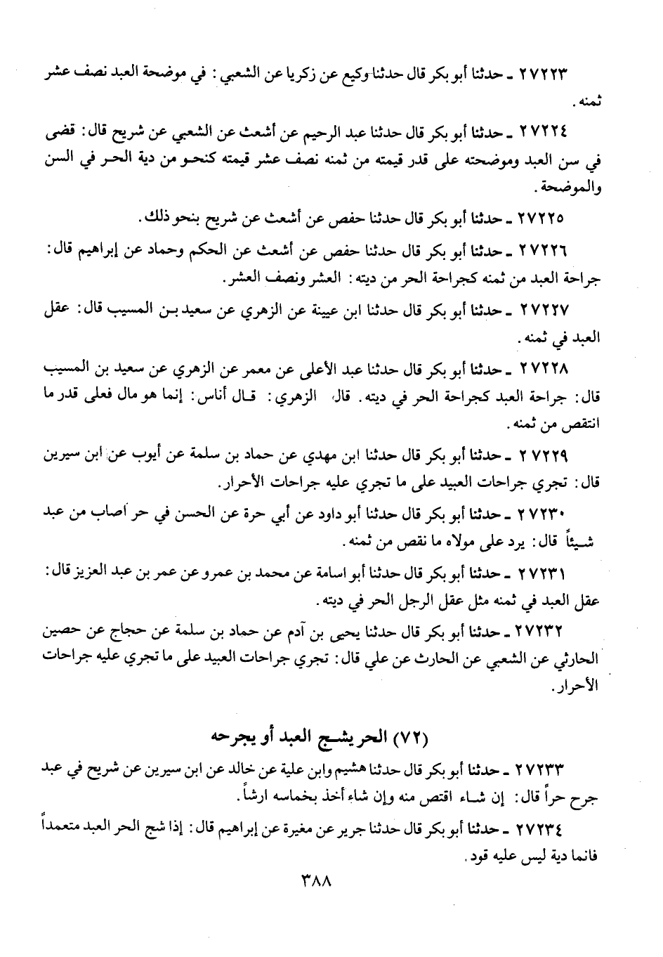 27232 - حَدَّثَنَا أَبُو بَكْرٍ قَالَ: حَدَّثَنَا يَحْيَى بْنُ آدَمَ، عَنْ حَمَّادِ بْنِ سَلَمَةَ، عَنْ حَجَّاجٍ، عَنْ حُصَيْنٍ الْحَارِثِيِّ، عَنِ الشَّعْبِيِّ، عَنِ الْحَارِثِ، عَنْ عَلِيٍّ، قَالَ: «§تَجْرِي جِرَاحَاتُ الْعَبِيدِ عَلَى مَا تَجْرِي عَلَيْهِ جِرَاحَاتُ الْأَحْرَارِ»