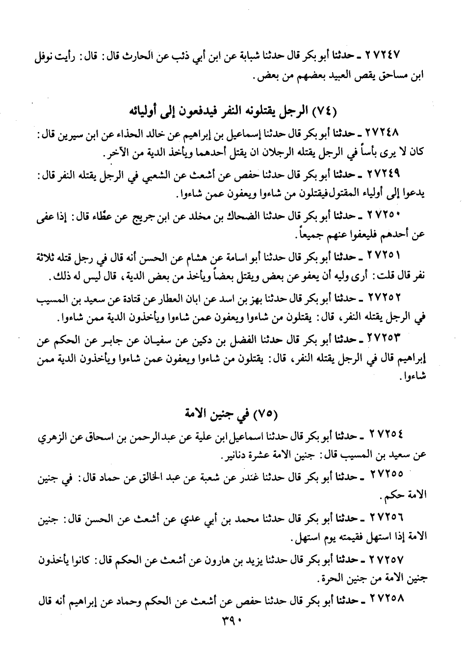 27249 - حَدَّثَنَا أَبُو بَكْرٍ قَالَ: حَدَّثَنَا حَفْصٌ، عَنْ أَشْعَثَ، عَنِ الشَّعْبِيِّ، فِي الرَّجُلِ يَقْتُلُهُ النَّفَرُ، قَالَ: «§يَدَعُوا إِلَى أَوْلِيَاءِ الْمَقْتُولِ فَيَقْتُلُونَ مَنْ شَاءُوا، وَيَعْفُونَ عَمَّنْ شَاءُوا»