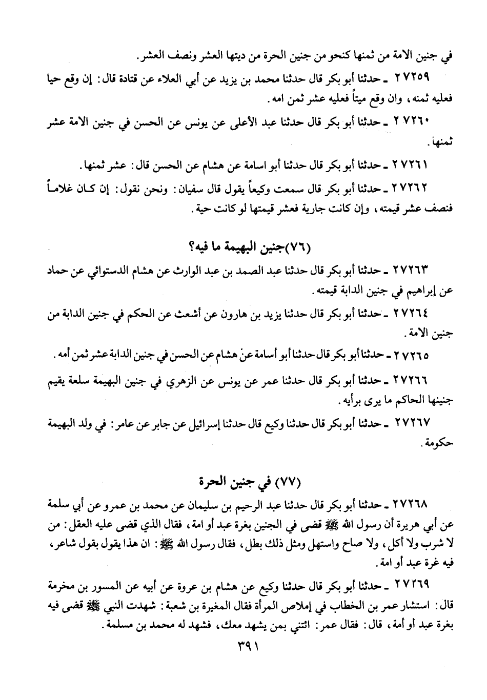 27266 - حَدَّثَنَا أَبُو بَكْرٍ قَالَ: حَدَّثَنَا عُمَرُ، عَنْ يُونُسَ، عَنِ الزُّهْرِيِّ: «§فِي جَنِينِ الْبَهِيمَةِ سِلْعَةٌ يُقَيِّمُ جَنِينَهَا الْحَاكِمُ مَا يَرَى بِرَأْيِهِ»