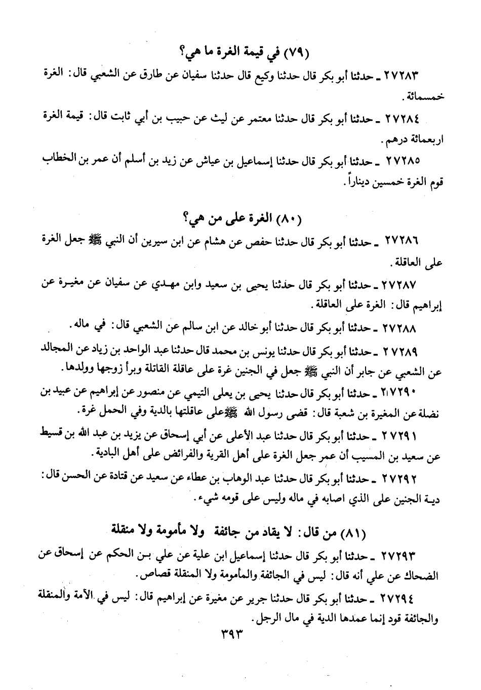 27283 - حَدَّثَنَا أَبُو بَكْرٍ قَالَ: حَدَّثَنَا وَكِيعٌ، قَالَ حَدَّثَنَا سُفْيَانُ، عَنْ طَارِقٍ، عَنِ الشَّعْبِيِّ، قَالَ: «§الْغُرَّةُ خَمْسُمِائَةٍ»