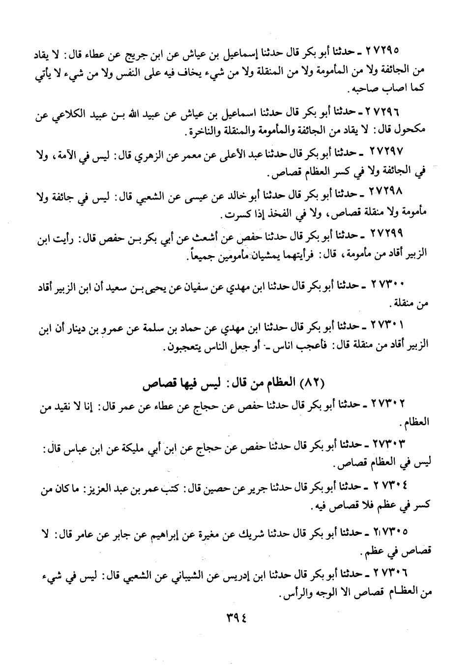 27303 - حَدَّثَنَا أَبُو بَكْرٍ قَالَ: حَدَّثَنَا حَفْصٌ، عَنْ حَجَّاجٍ، عَنِ ابْنِ أَبِي مُلَيْكَةَ، عَنِ ابْنِ عَبَّاسٍ، قَالَ: «§لَيْسَ فِي الْعِظَامِ قِصَاصٌ»