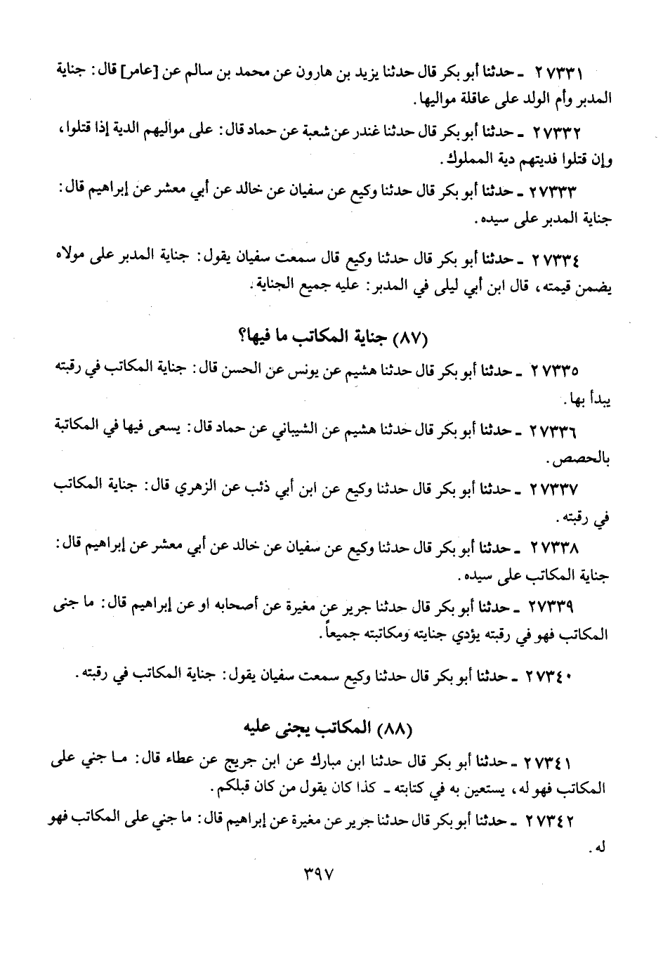 27338 - حَدَّثَنَا أَبُو بَكْرٍ قَالَ: حَدَّثَنَا وَكِيعٌ، عَنْ سُفْيَانَ، عَنْ خَالِدٍ، عَنْ أَبِي مَعْشَرٍ، عَنْ إِبْرَاهِيمَ، قَالَ: «§جِنَايَةُ الْمُكَاتَبِ عَلَى سَيِّدِهِ»