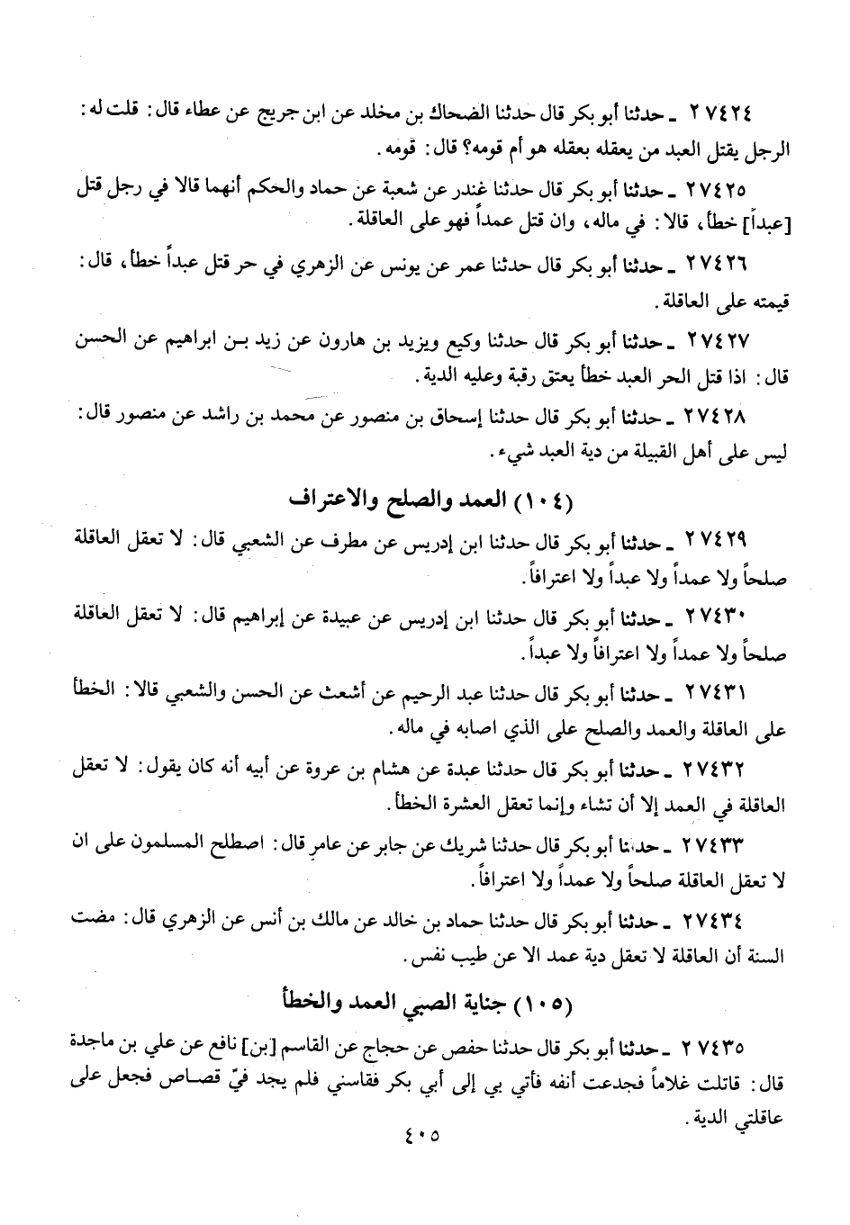 27429 - حَدَّثَنَا أَبُو بَكْرٍ قَالَ: حَدَّثَنَا ابْنُ إِدْرِيسَ، عَنْ مُطَرِّفٍ، عَنِ الشَّعْبِيِّ، قَالَ: «§لَا تَعْقِلُ الْعَاقِلَةُ صُلْحًا، وَلَا عَمْدًا، وَلَا عَبْدًا، وَلَا اعْتِرَافًا»