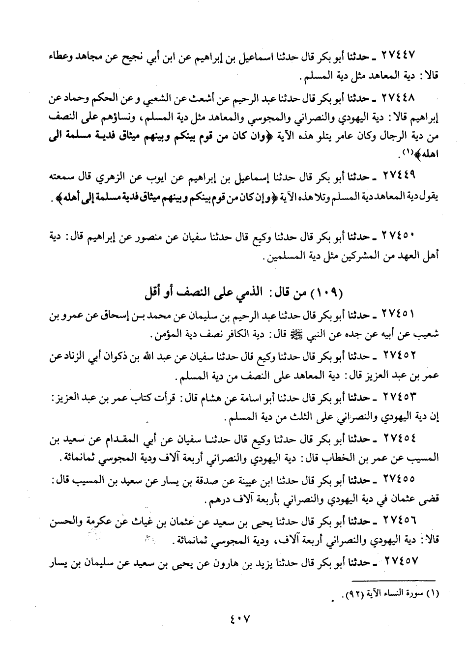 27448 - حَدَّثَنَا أَبُو بَكْرٍ قَالَ: حَدَّثَنَا عَبْدُ الرَّحِيمِ، عَنْ أَشْعَثَ، عَنِ الشَّعْبِيِّ، وَعَنِ الْحَكَمِ، وَحَمَّادٍ، عَنْ إِبْرَاهِيمَ، قَالَا: «§دِيَةُ الْيَهُودِيِّ وَالنَّصْرَانِيِّ وَالْمَجُوسِيِّ وَالْمُعَاهَدِ مِثْلُ دِيَةِ الْمُسْلِمِ، وَنِسَاؤُهُمْ عَلَى النِّصْفِ مِنْ دِيَةِ الرِّجَالِ» وَكَانَ عَامِرٌ يَتْلُو هَذِهِ الْآيَةَ {«وَإِنْ كَانَ مِنْ قَوْمٍ بَيْنَكُمْ وَبَيْنَهُمْ مِيثَاقٌ فَدِيَةٌ مُسَلَّمَةٌ إِلَى أَهْلِهِ»} [النساء: 92]
