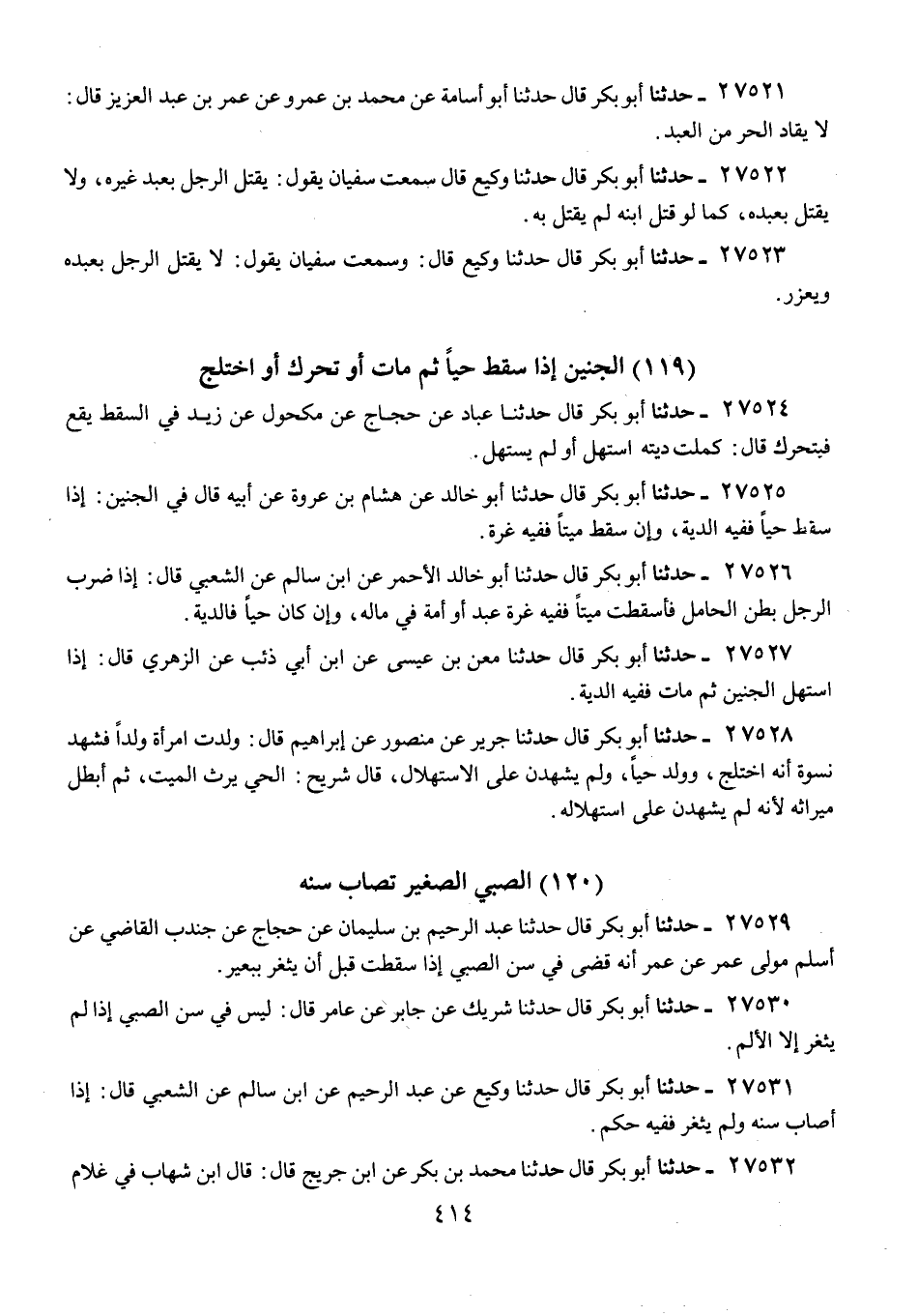 27523 - حَدَّثَنَا أَبُو بَكْرٍ قَالَ: حَدَّثَنَا وَكِيعٌ، قَالَ: وَسَمِعْتُ سُفْيَانَ، يَقُولُ: «§لَا يُقْتَلُ الرَّجُلُ بِعَبْدِهِ وَيُعَزَّرُ»