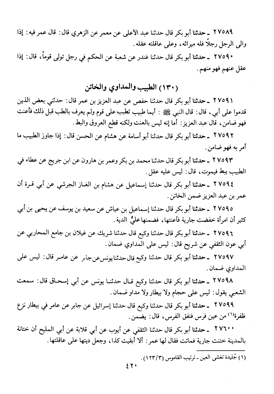 27596 - حَدَّثَنَا أَبُو بَكْرٍ قَالَ: حَدَّثَنَا وَكِيعٌ، قَالَ: حَدَّثَنَا شَرِيكٌ، عَنْ غَيْلَانَ بْنِ جَامِعٍ الْمُحَارِبِيِّ، عَنْ أَبِي عَوْنٍ الثَّقَفِيِّ، عَنْ شُرَيْحٍ، قَالَ: «§لَيْسَ عَلَى الْمُدَاوِي ضَمَانٌ»