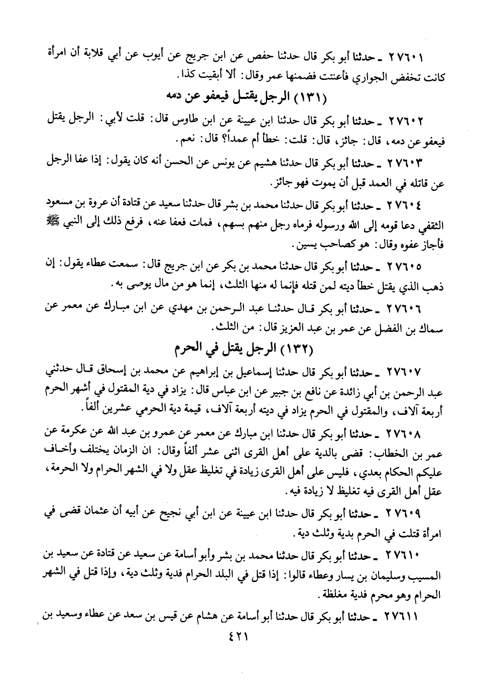 27611 - حَدَّثَنَا أَبُو بَكْرٍ قَالَ: حَدَّثَنَا أَبُو أُسَامَةَ، عَنْ هِشَامٍ، عَنْ قَيْسِ بْنِ سَعْدٍ، عَنْ عَطَاءٍ، وَسَعِيدِ بْنِ جُبَيْرٍ، وَمُجَاهِدٍ، أَنَّهُمْ قَالُوا فِي الَّذِي يُقْتَلُ فِي الْحُرُمِ دِيَةٌ وَثُلُثُ دِيَةٍ وَقَالَ أَحَدُهُمْ: «أَحْسِبُهُ» قَالَ سَعِيدَ بْنَ جُبَيْرٍ: «§وَالَّذِي يُقْتَلُ فِي الْحُرُمِ دِيَةٌ وَثُلُثُ دِيَةٍ»